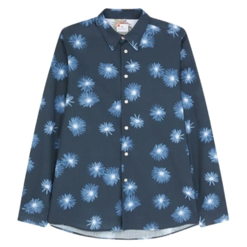 The PS Paul Smith shirt with “Luminescent Floral” print is a distinctive and refined piece. Made from 100% cotton, it features a regular fit, long sleeves, a soft point collar, and a front closure with shell buttons. The elegant details are enhanced by contrasting lining on yoke and cuffs, adding a touch of personality. The all-over floral print on a blue background creates a unique, modern, and sophisticated visual effect.