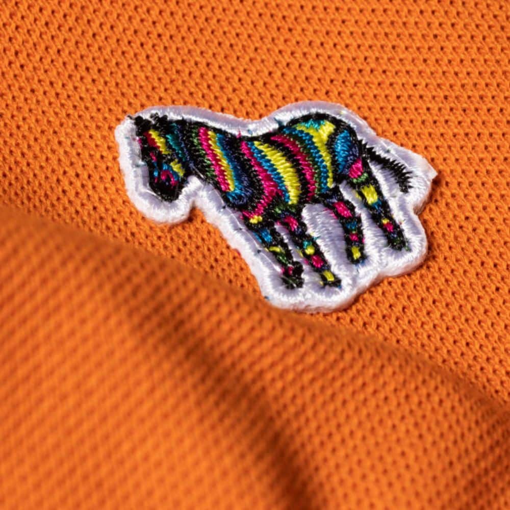 Paul Smith orange polo shirt with zebra logo in regular fit. This classic short sleeve orange polo shirt is finished with an embroidered multi coloured broad stripe zebra logo on the chest and two-button placket. Made from 100% Organic Cotton