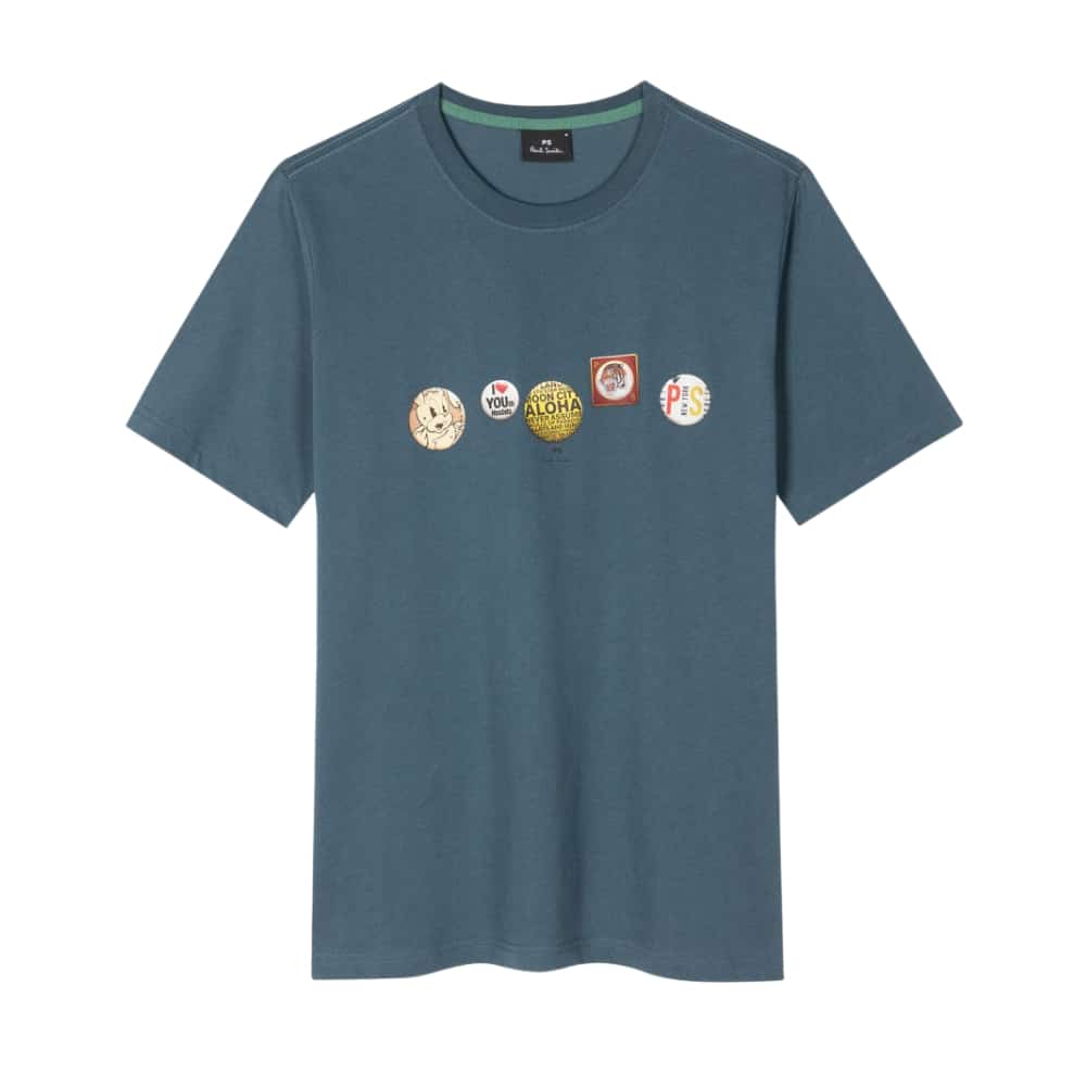This Paul Smith Regular fit Teal T-Shirt is made from 100% organically grown cotton jersey for a soft finish, and features a badges line up print across the chest.