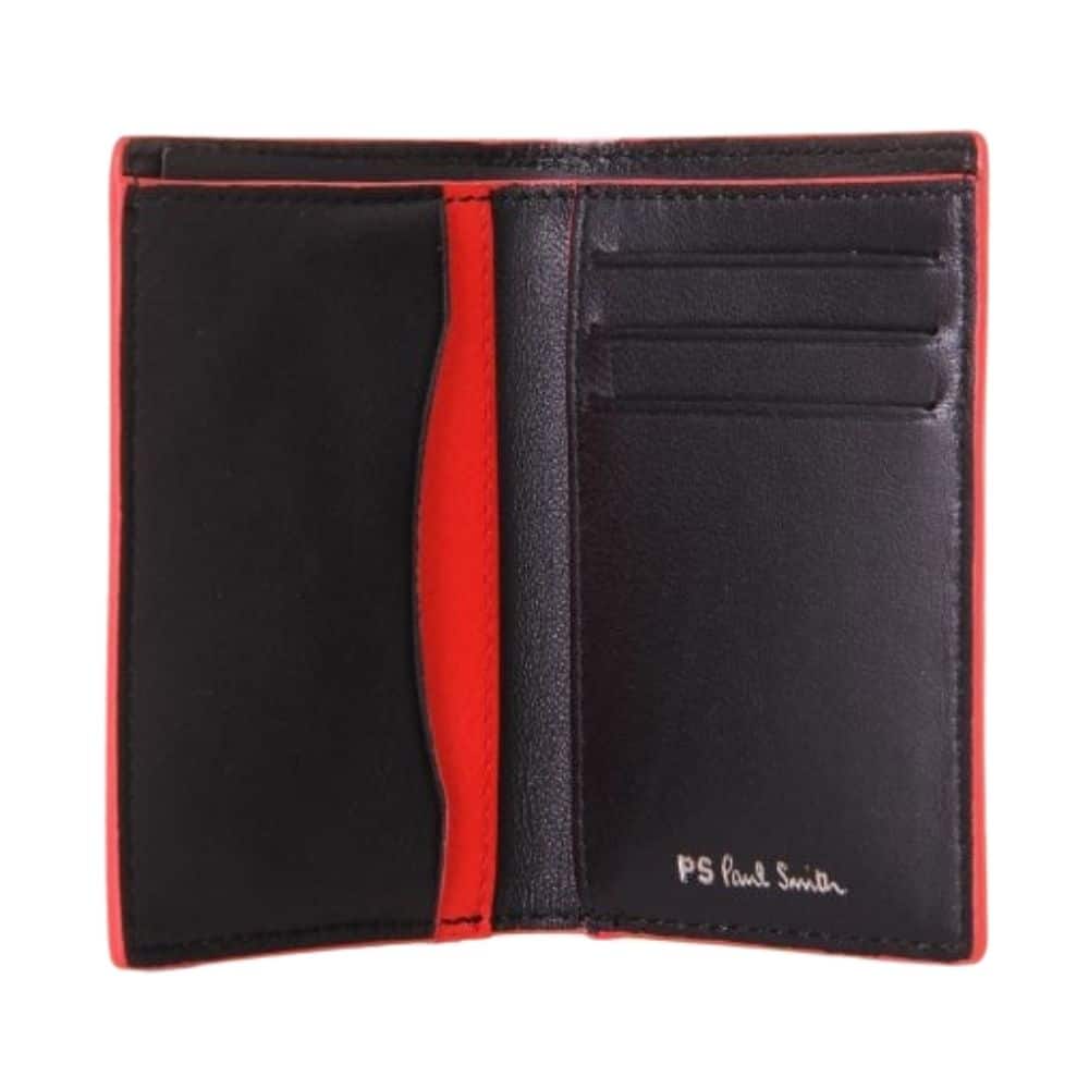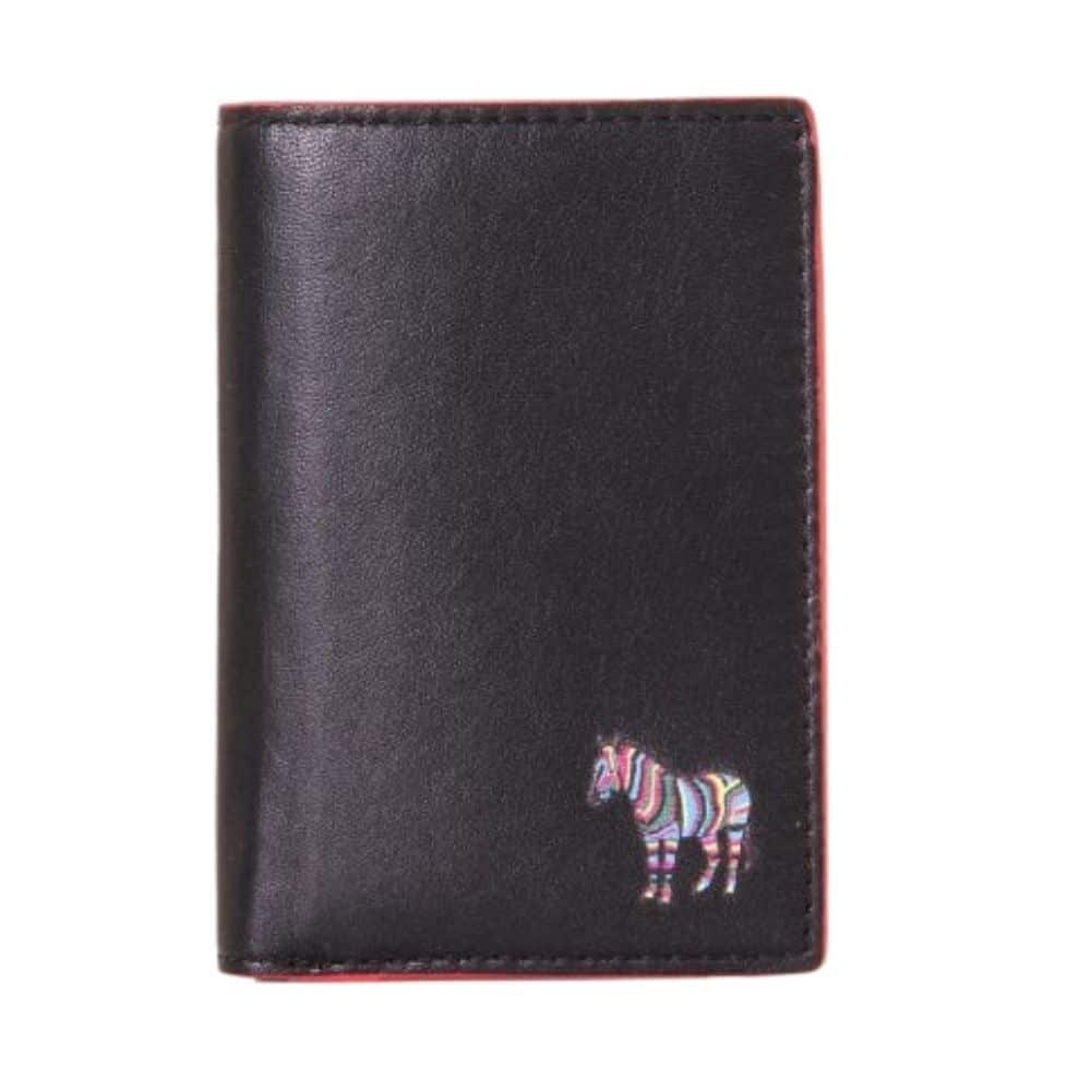 Paul Smith slim credit card wallet in black textured leather, bright red trim with printed zebra on the front. 5 card slots and 1 notes slot. Paul Smith signature on the inside.