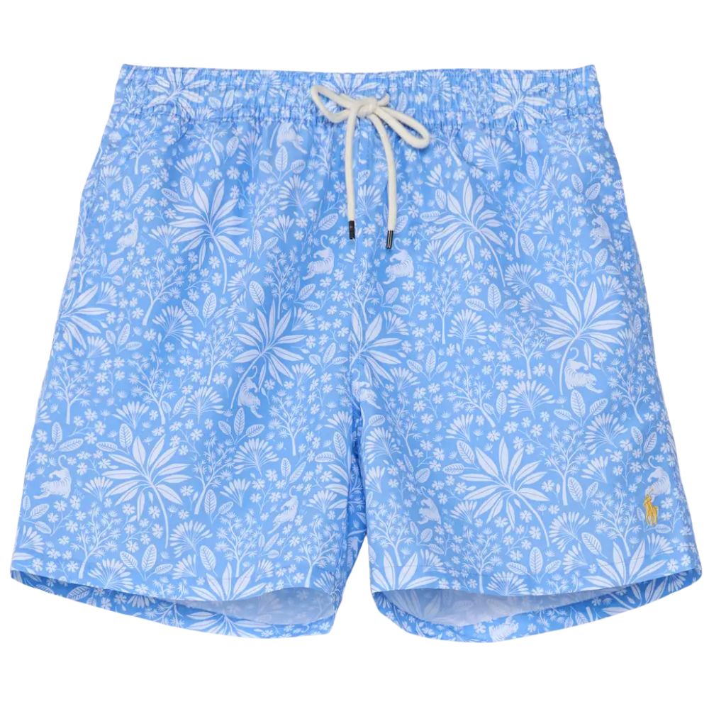 These Ralph Lauren light blue recycled polyester-blend swim shorts in regular fit, mid-rise, elasticated drawstring waistband, two slip pockets at sides, embroidered branding at hem, buttoned flap pocket at back, branded patch at back, and partially lined.