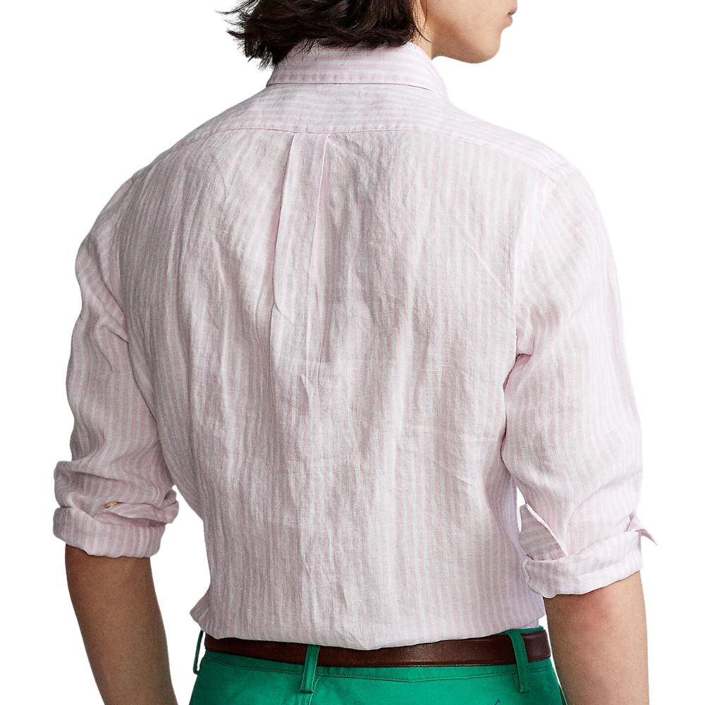 This Polo Ralph Lauren long sleeve shirt is crafted from a comfortable cotton blend. This shirt offers all-day comfort and a crisp, polished look, while the classic pink and white striped pattern adds a touch of timeless style, perfect for both casual and smart casual occasions.