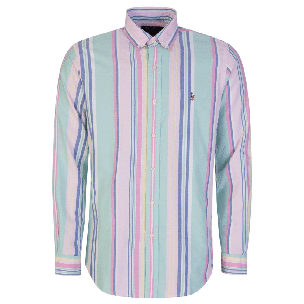 Polo Ralph Lauren Stripe Long Sleeved Sport Shirt In Pink. Custom Fit. An all over vertical striped design in pink, white, blue and green with a full front pearlescent button opening in off white and a pearlescent button down shirt collar. Pearlescent button fastening cuffs on the long sleeves. The signature Ralph Lauren Polo Player logo is embroidered on the chest in brown, blue, white and cream. A central pleat on the reverse with a curved hem design and top stitching on the seams in white. 100% Cotton.