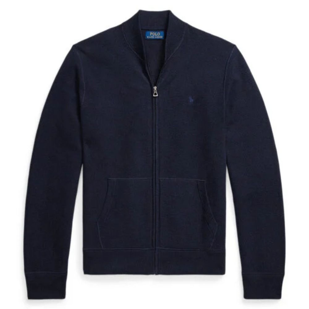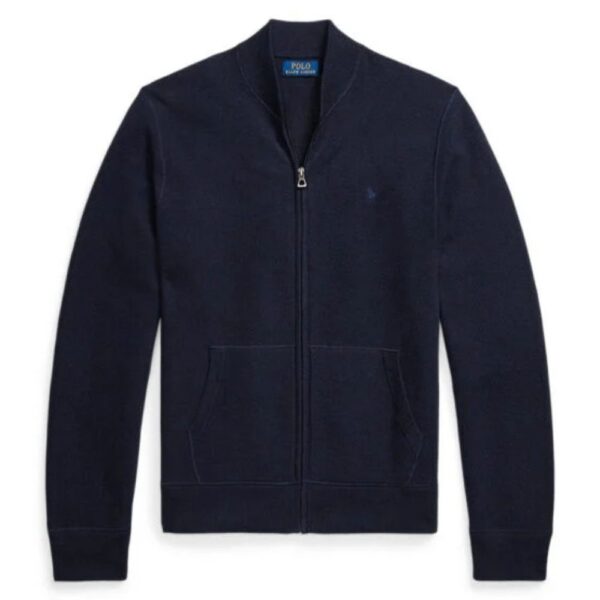 This full-zip jumper is knit with soft combed cotton and accented with a contrasting hue on the interior neck.