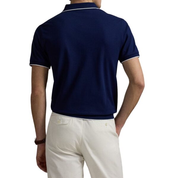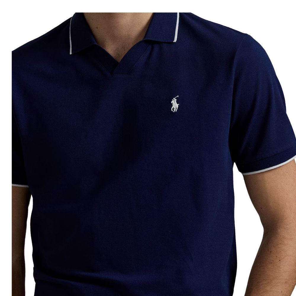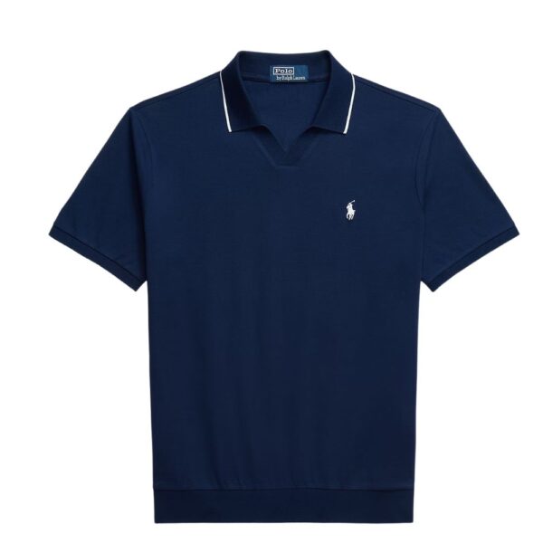 This Polo Ralph Lauren Navy Johnny collar – a small round or pointed dress collar that has a front split and that fits close to the neck – with contrast tipping, short sleeves, and rib knit armbands with contrast tipping. Made with cotton jacquard mesh and finished with our signature embroidered Pony.