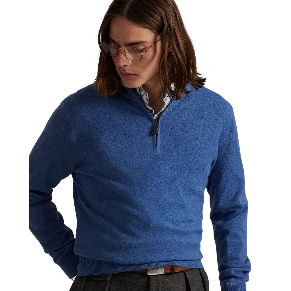 A refined layering piece in a fresh seasonal tone. Crafted from soft knit fabric, this sky blue quarter-zip knit jumper features a quarter-zip neckline for versatile styling and all-day comfort. Finished with the signature embroidered Polo Pony, it’s an effortlessly polished choice for both casual and smart-casual looks.