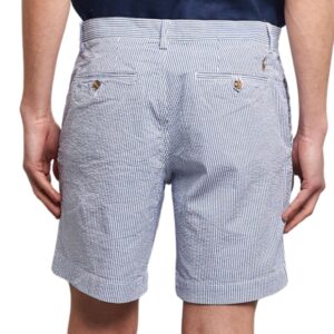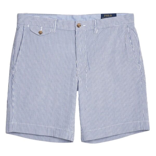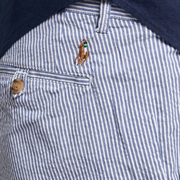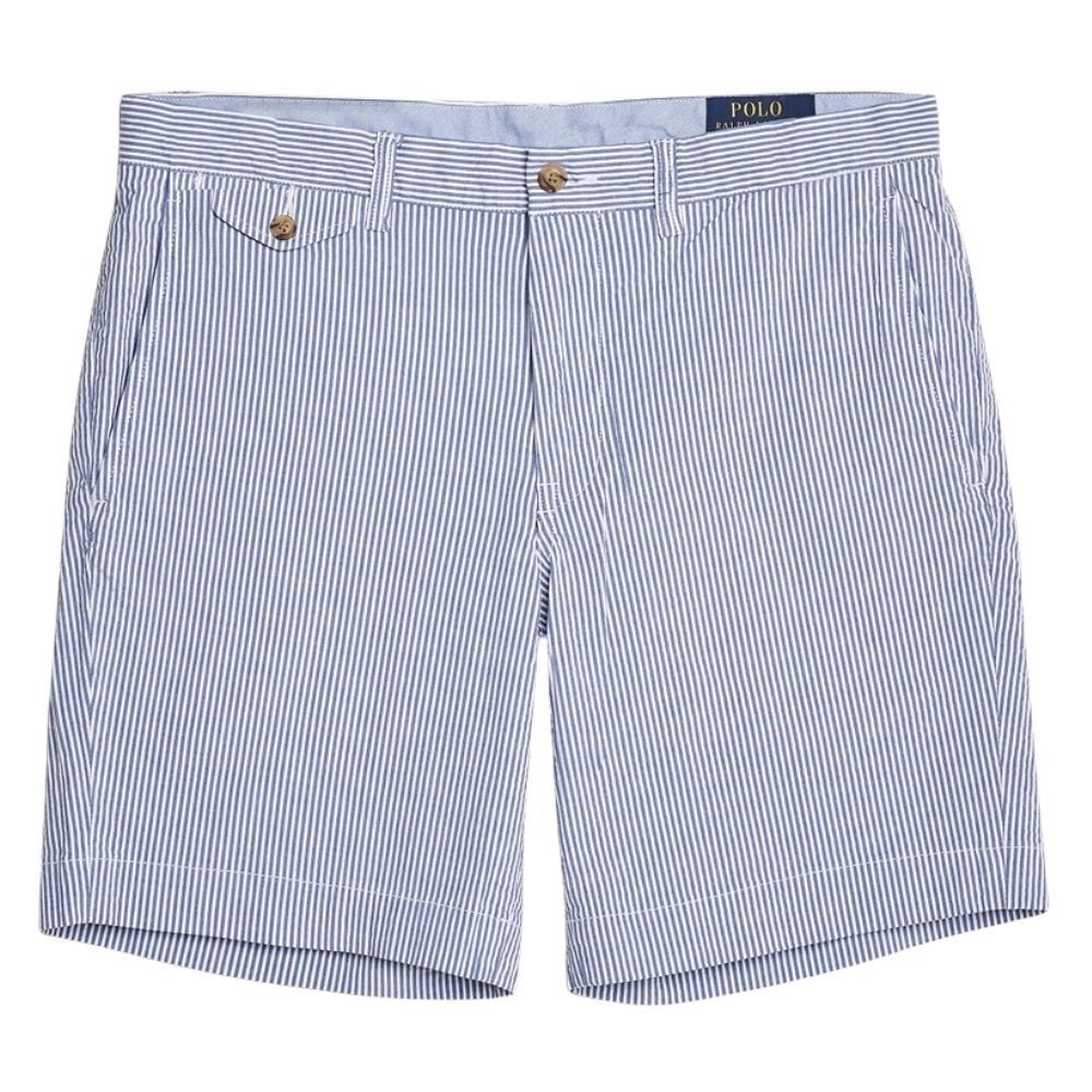 The Polo Ralph Blue and white stripped seersucker shorts with a casual fit are ideal for the warmer days during the summer months.