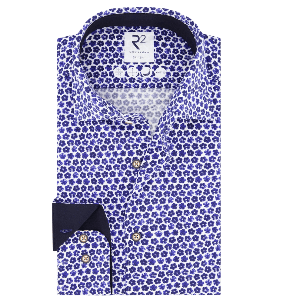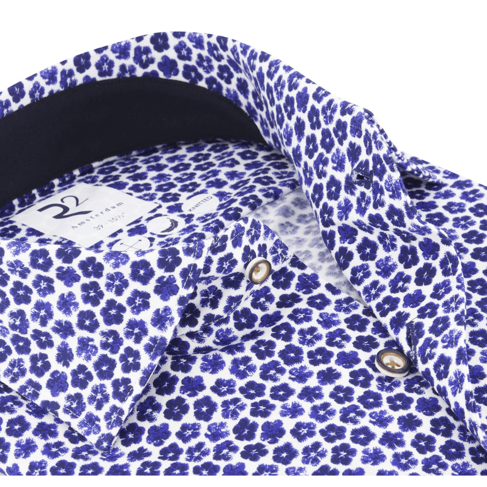 This R2 Amsterdam Blue shirt with a flower pattern on the body, with the same pattern on the inside of the collar and cuffs. The shirt has single cuffs and contrasting buttons for stylish detail.