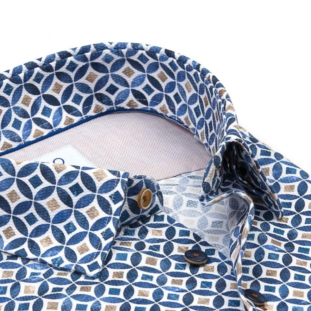 This dress shirt from R2 has an all over printed circle tile pattern. Featuring a spread collar, single cuffs and contrasting buttons for stylish detail. Cut in a slim for a modern, tailored look. Wear this shirt dressed up with our selection of trousers and jackets or dress more casual with our jeans.