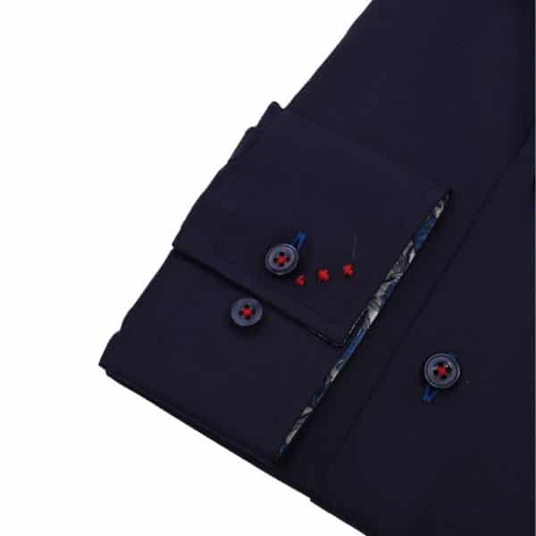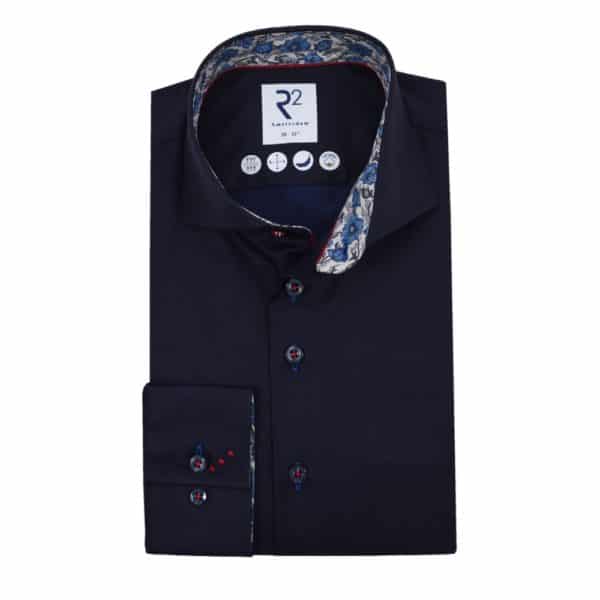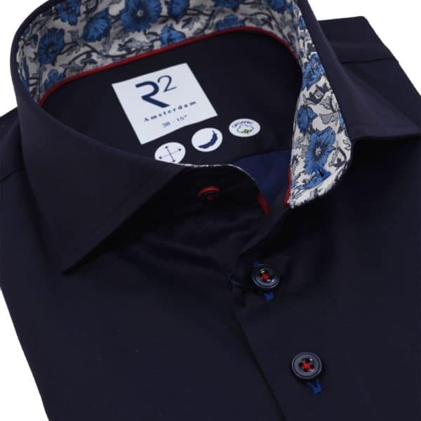This R2 Amsterdam Navy shirt with Liberty Art Fabric, has a floral print inside the collar, cuffs, a shark collar, and contrasting buttons. Perfect for the summer.