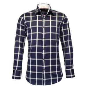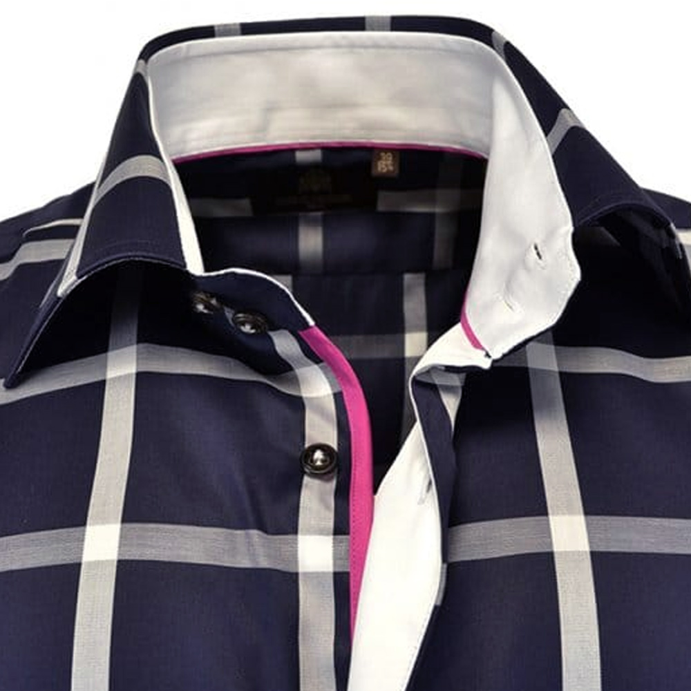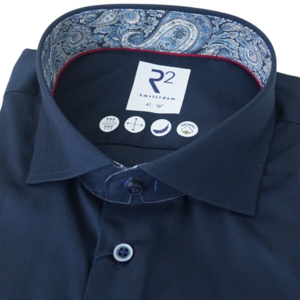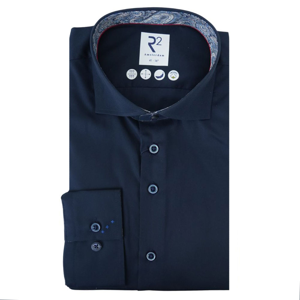 This R2 Amsterdam Navy shirt with Liberty Art Fabric, has a paisley print inside the collar, cuffs, a shark collar, and contrasting buttons.