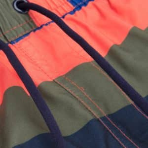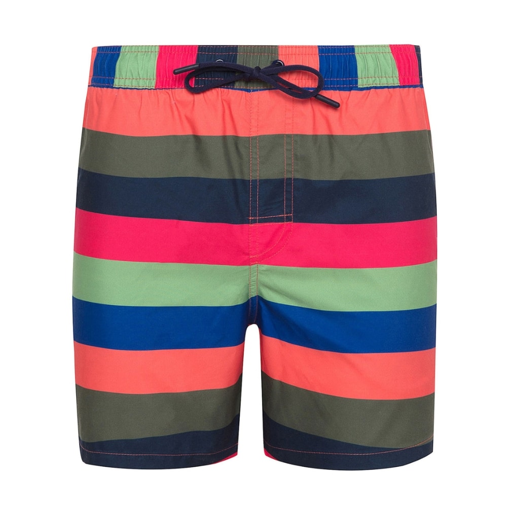 This R2 Amsterdam Multi colour stripe swim shorts with elasticated waist band with draw string, two side pockets, rear pockets, inner pocket, and a carry bag.