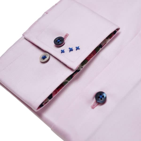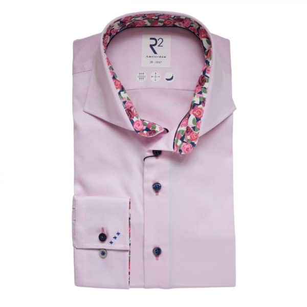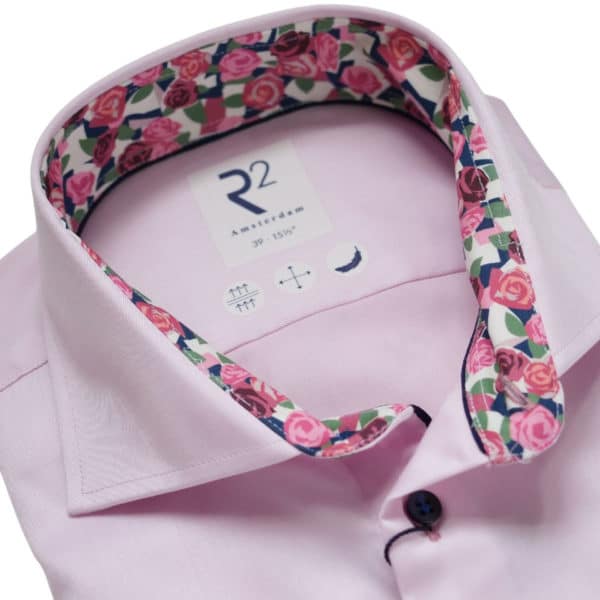 This R2 Amsterdam Pink shirt with Liberty Art Fabric, has a Rose floral print inside the collar, cuffs, a shark collar, and contrasting buttons. Perfect for the summer.