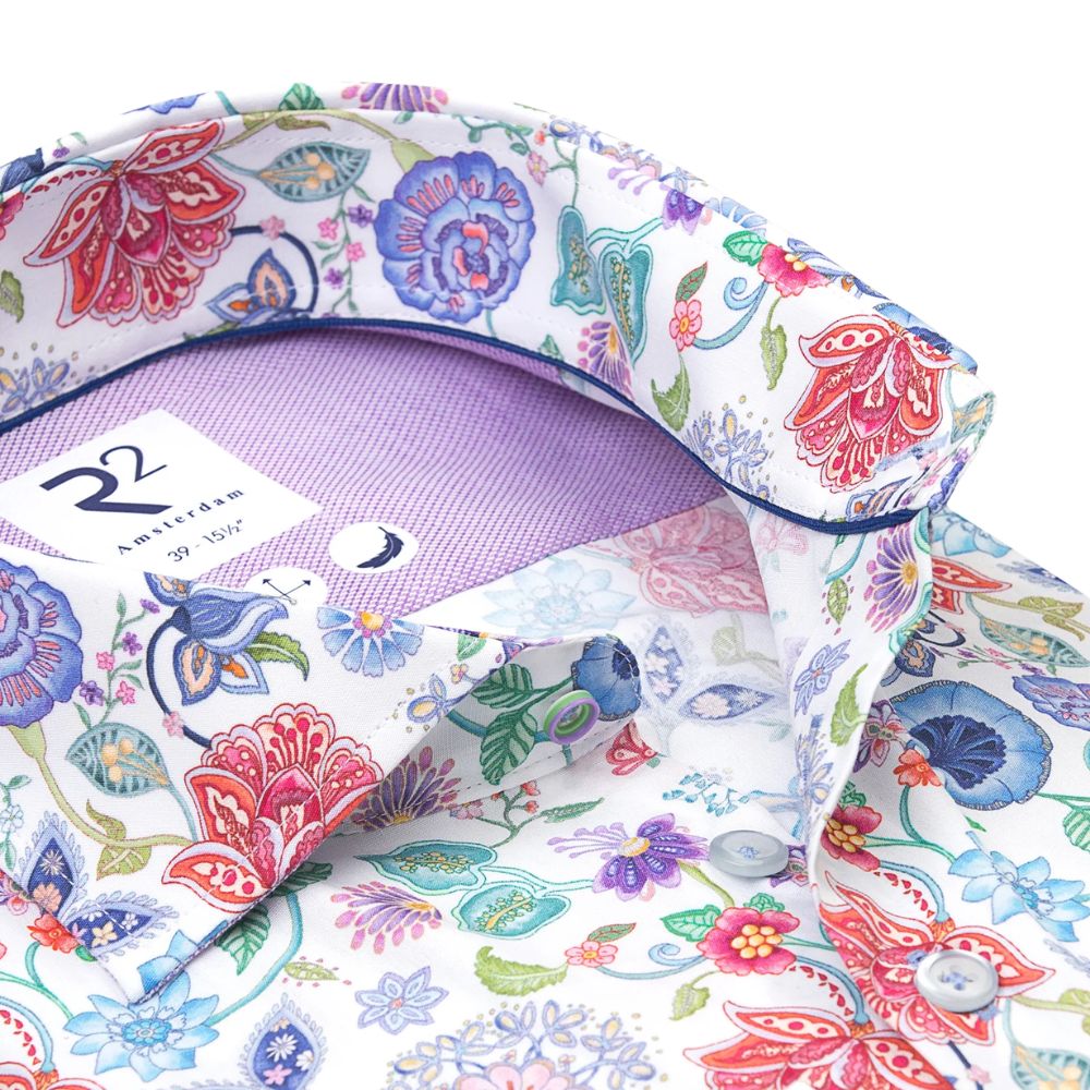 This dress shirt has a graphic pattern with a striking circle pattern collar insert. The widespread collar, single cuffs and contrasting buttons compliment the fashionable look of the shirt.