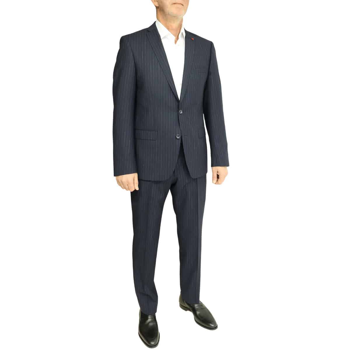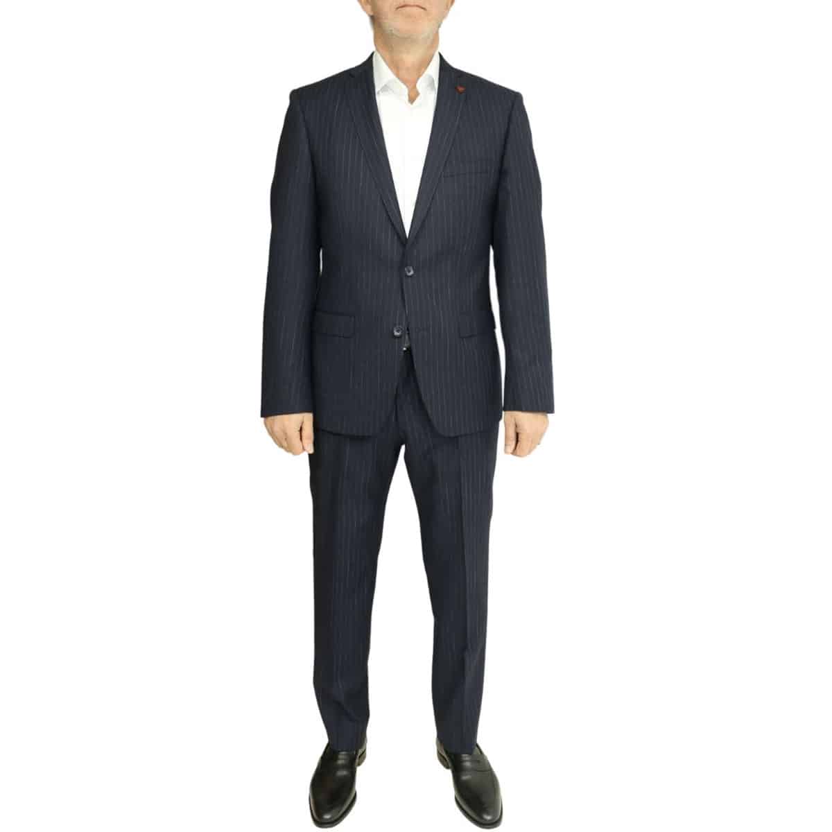 This Roy Robson navy chalk stripe suit in slim fitting has a Italian cloth, it features side vents, flat front trousers and is dry clean only.