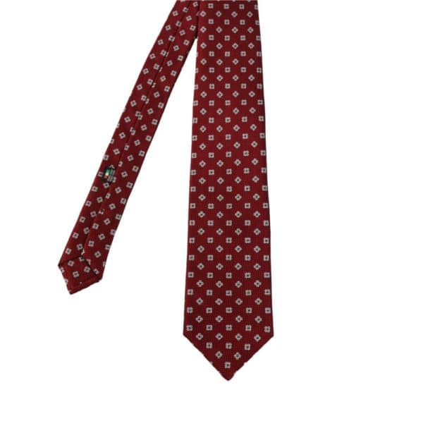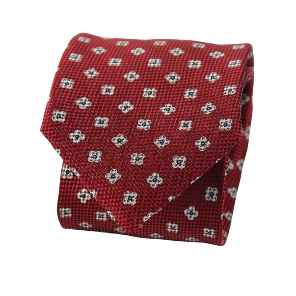 The Silvio Fiorello Square and Diamond Flower Tie in Burgundy features a fine silk printed with a pattern of square and diamond shaped flowers. This tie is made in Italy with a slim cut for a modern shape.