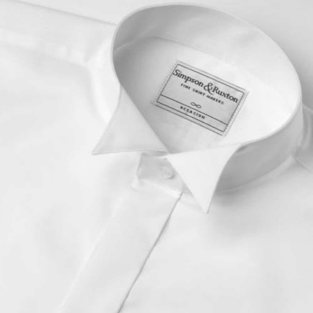 Polyester and cotton plain white classic winged dress shirt, double cuff and a fly front.
