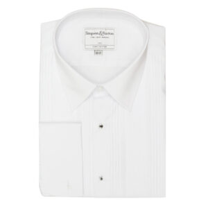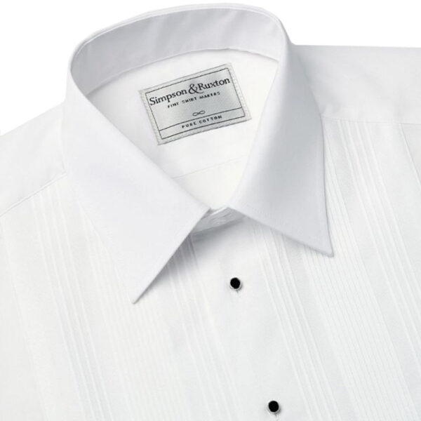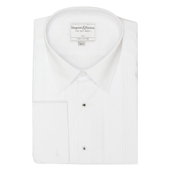 Pure cotton White regular collar dress shirt with balanced woven pleated front and double cuffs. Presented with complementary studs.