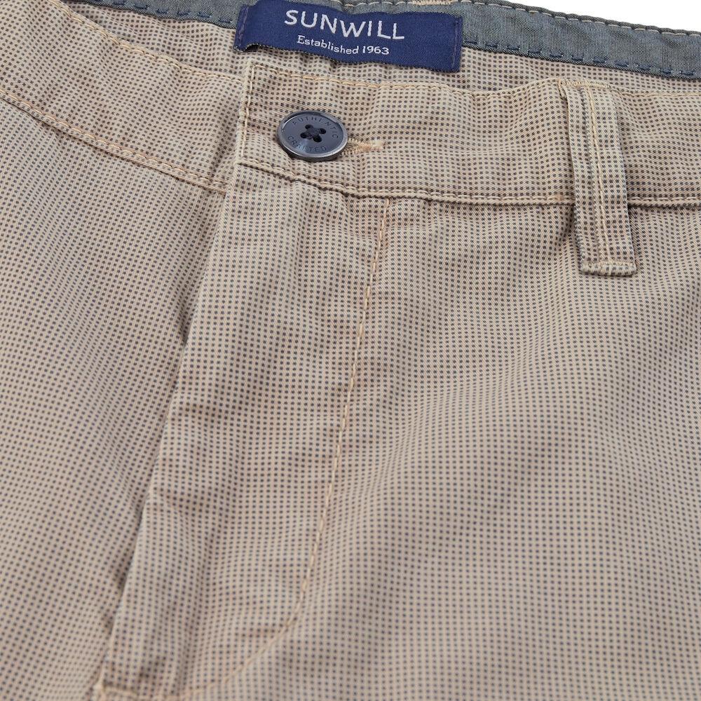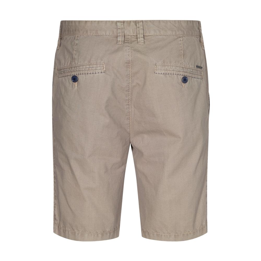 Shorts with a pin-head detail in a printed meter piece. Contrast details at front and back pockets. The shorts have been lightly washed so they feel comfortable and have a nice look. The elastane content ensures good comfort and a perfect fit. The shorts have slanted pockets at the front, while at the back there are double welt pockets with buttons. The model has a zip closure.