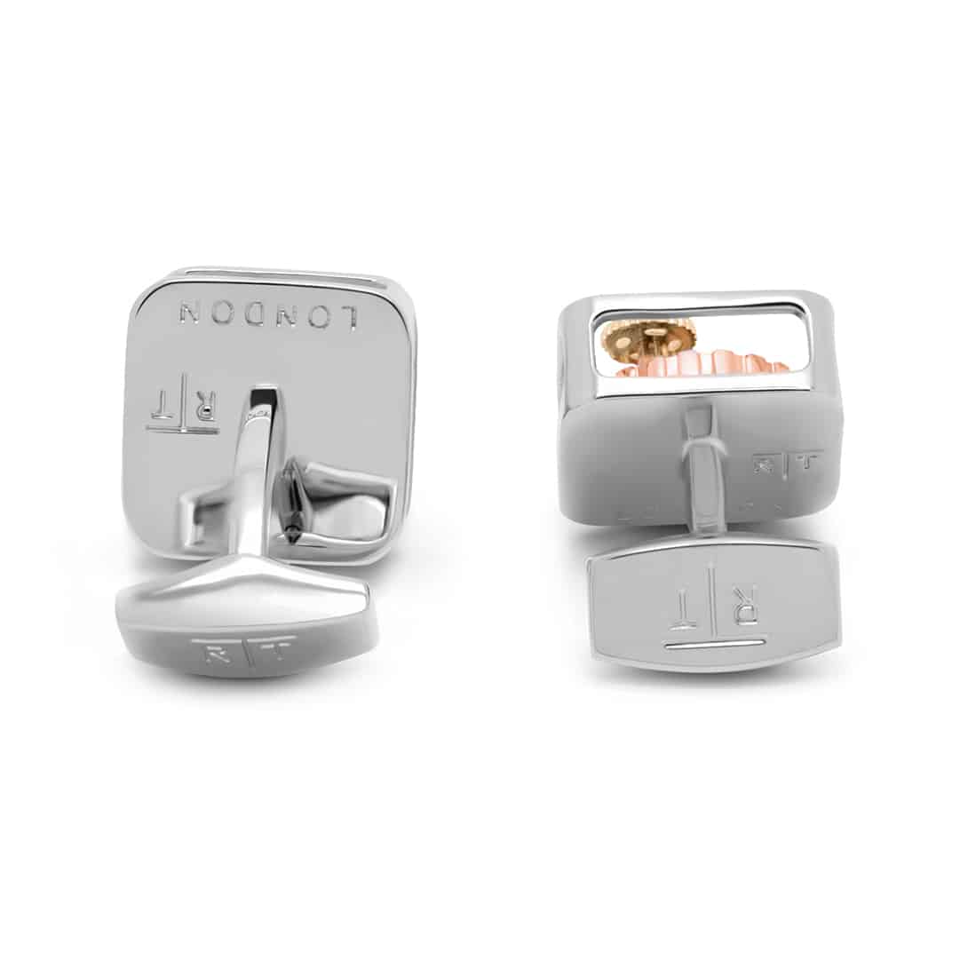 Inspired by mechanical watches movements, the timeless square shape in white feature a rhodium-plated finish, frames 5 individual multi-coloured gears, 3 of which rotate by touch.