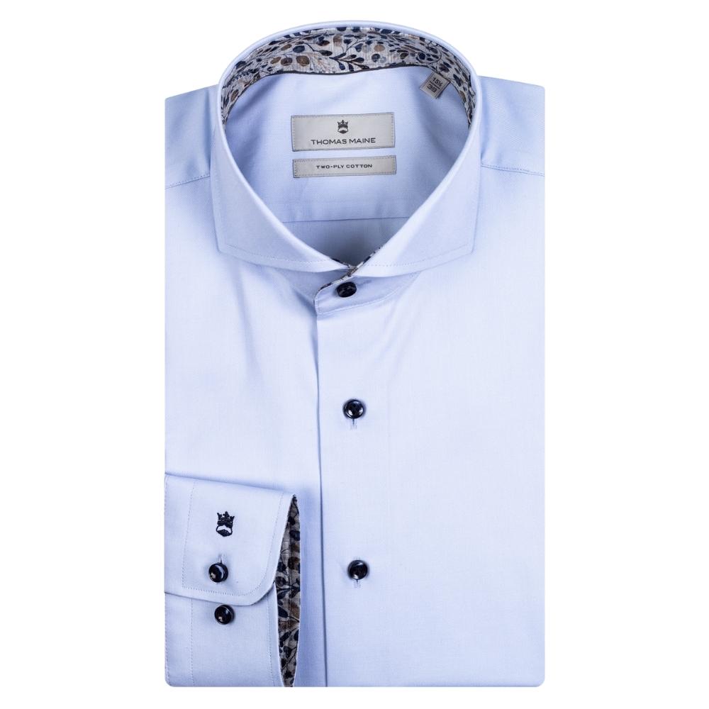Thomas Maine shirts are woven from the finest Italian cotton. Contrasting Sliver floral trim inside the collar and cuffs give a modern feel. The shirt has a full button placket and a cutaway collar. A versatile shirt that can be worn either smart or casual.