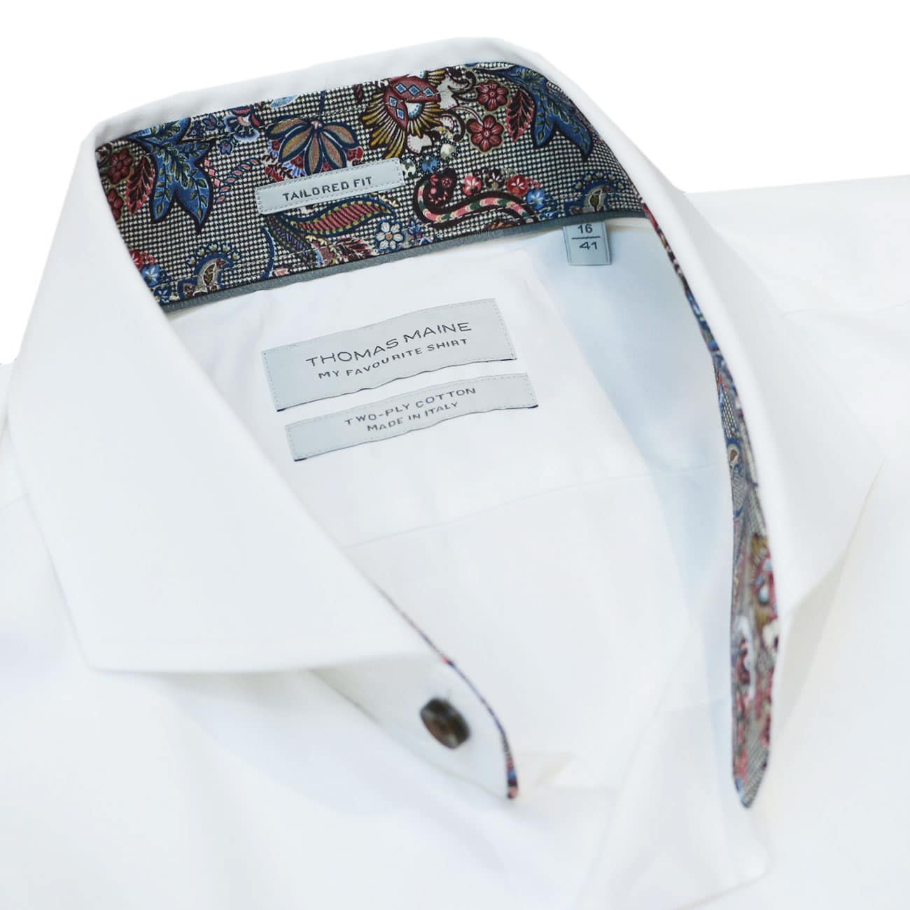 Thomas Maine shirts are woven from the finest Egyptian cotton. The shirt has a full button placket and a cutaway collar. A versatile shirt that can be worn either smart or casual also made in Italy.