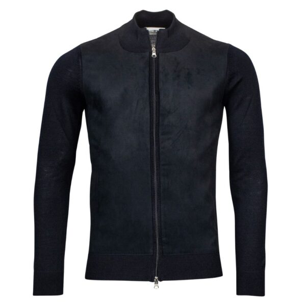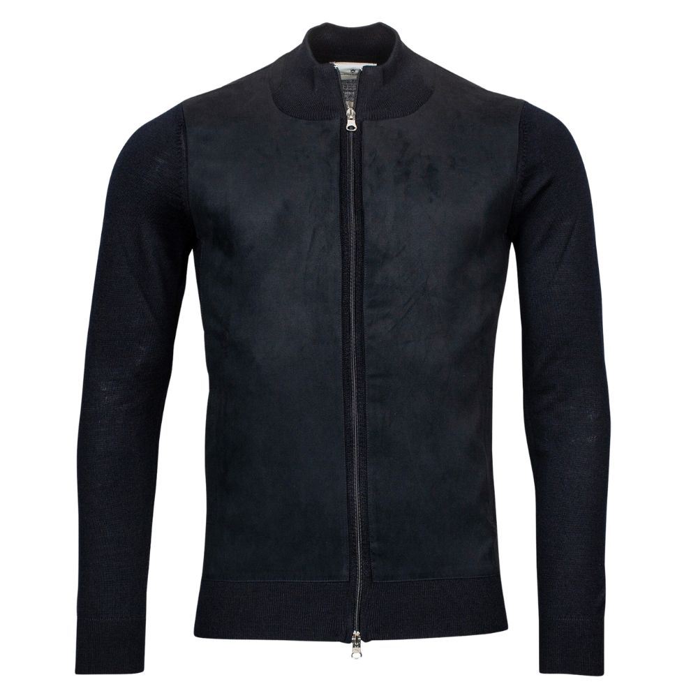 An effortless staple for casual and formal wear, this hybrid cardigan features a suede fabric on the front for the perfect sleek insulation on colder days. Match with blue jeans and white trainers to compete the look.