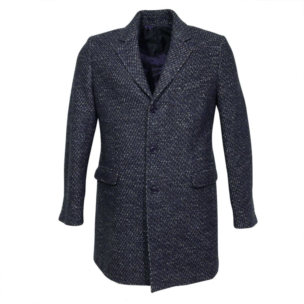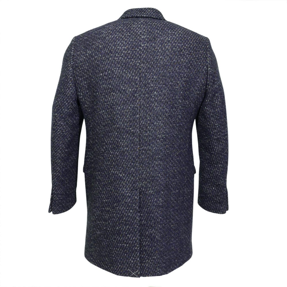 This Thomas Maine single breasted coat in blue multi fleck is a design that will create a distinctive impression. The overcoat is perfect for layering, has three buttons, two front pockets with flaps, and a top pocket. There are two inside pockets and a small pen pocket.