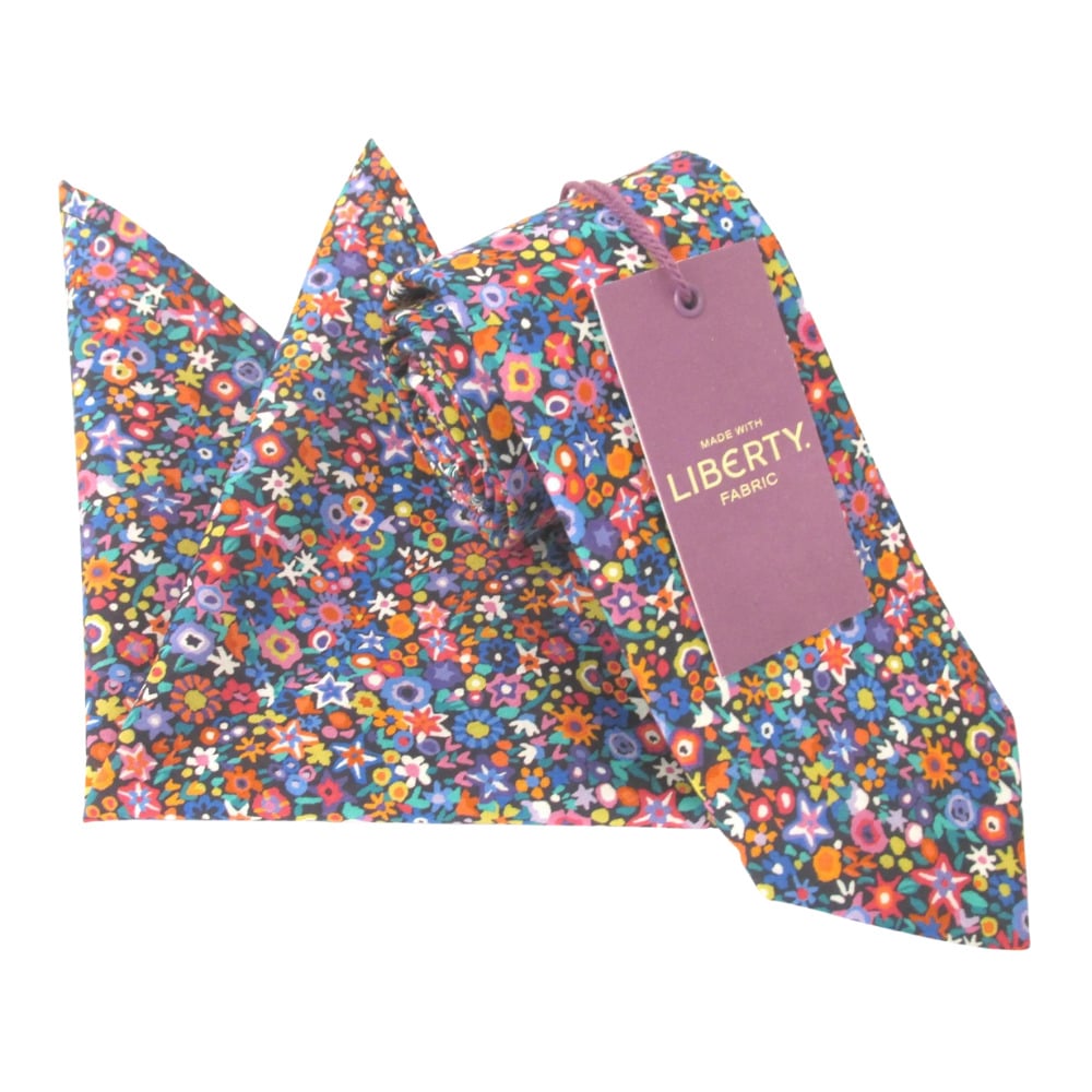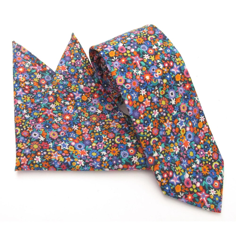 A Dazzle Cotton Tie and pocket square Made with Liberty Fabric. An absolutely stunning Van Buck cotton range using exclusive Liberty Tana Lawn® printed fabric. This tie and matching hank uses the Dazzle print featuring tiny multicoloured flowers on a navy ground. We also have matching bow ties and self-tie bow ties available. This collection includes a range of different Liberty patterns which are all perfect for wedding ties, prom ties, events or even a day in the office. Order yours now and be sure to stand out with your dapper style!