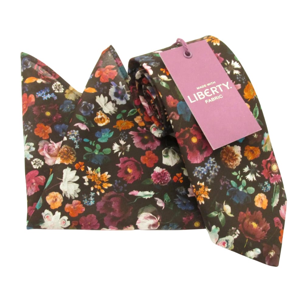 A Floral Edit Cotton Tie and pocket square Made with Liberty Fabric. An absolutely stunning Van Buck cotton range using exclusive Liberty Tana Lawn® printed fabric. This tie and matching hank uses the Floral Edit print featuring a fantastic array of flowers in a multitude of colours including sage green, fuchsia, pink, blue, orange and cream on a dark mulberry ground. We also have matching bow ties and self-tie bow ties available. This collection includes a range of different Liberty patterns which are all perfect for wedding ties, prom ties, events or even a day in the office. Order yours now and be sure to stand out with your dapper style!