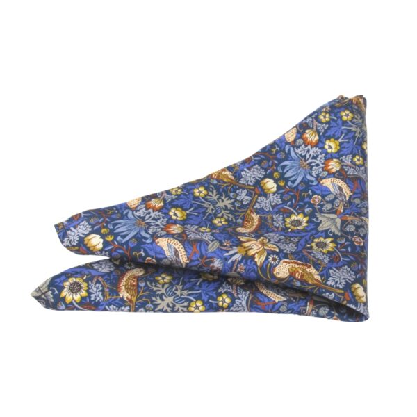 A stunning Warwicks Handkerchief in a sumptuous Navy with strong colours throughout. This set uses the famous William Morris Strawberry Thief Liberty fabric design featuring royal blue and white, red and yellow flowers and birds on a navy background.