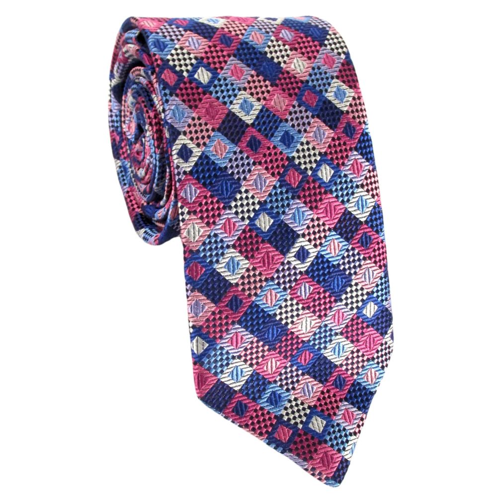 This Van Buck tie from their platinum range is a pure silk tie featuring a striking square pattern that blends a spectrum of vibrant pink and navy tones, creating a visually captivating design. Each square shape is filled with a different pattern.