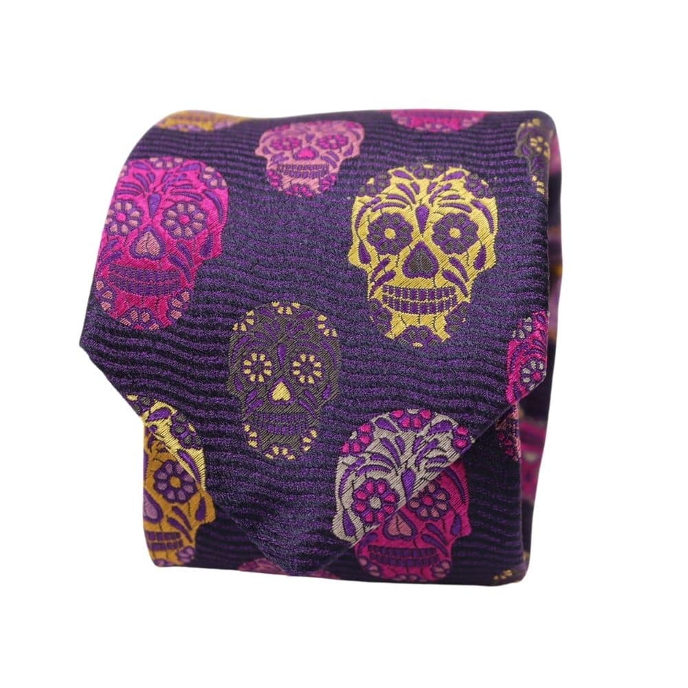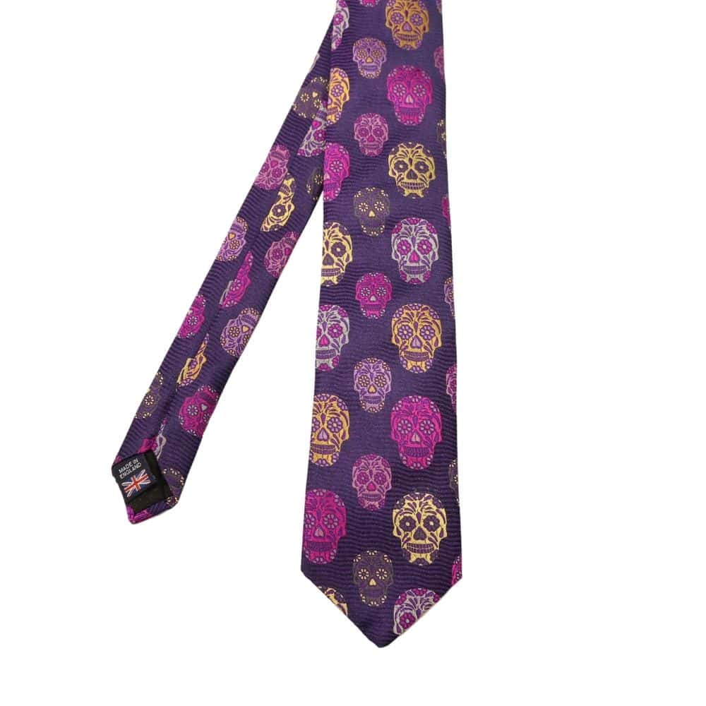 The Van Buck Skulls Tie in Purple adds a cool, eye catching detail to a smart outfit with its all over embroidered ‘Day of the Dead’ skull pattern and horizontal striped background.
