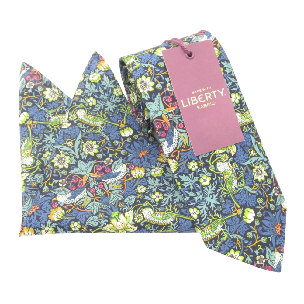 A green Strawberry Thief Cotton Tie and pocket square Made with Liberty Fabric. An absolutely stunning Van Buck cotton range using exclusive Liberty Tana Lawn® printed fabric. This tie and matching hank uses the Strawberry Thief print featuring berries and birds nesting in a hedgerow on a navy ground. We also have matching bow ties and self-tie bow ties available. This collection includes a range of different Liberty patterns which are all perfect for wedding ties, prom ties, events or even a day in the office. Order yours now and be sure to stand out with your dapper style!