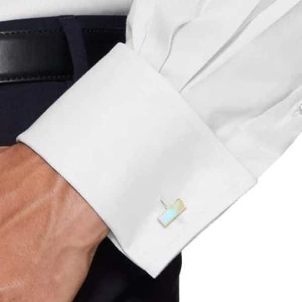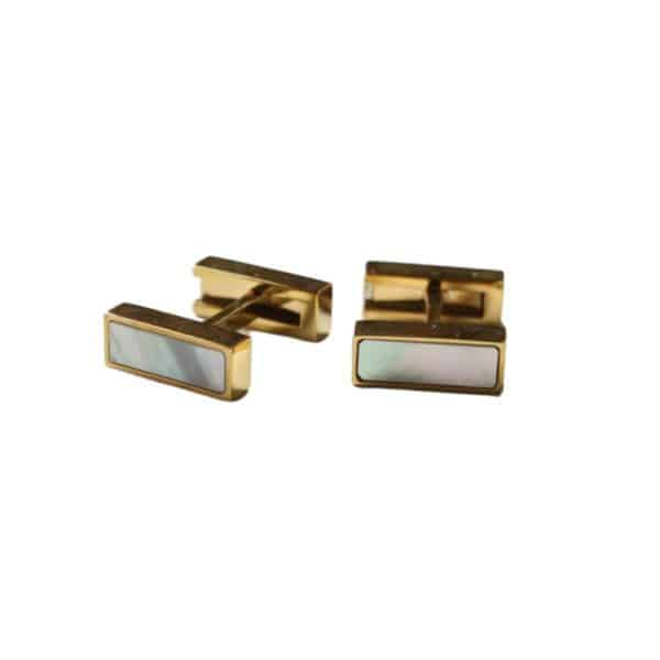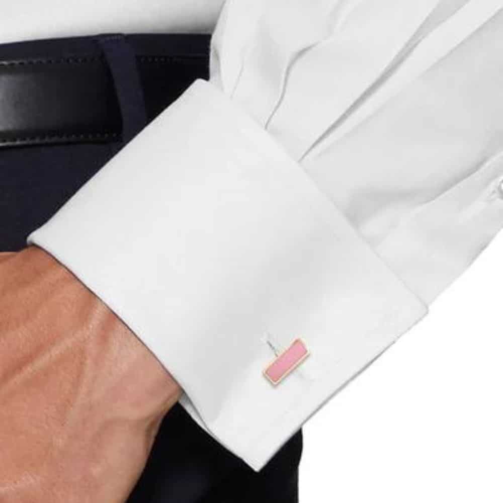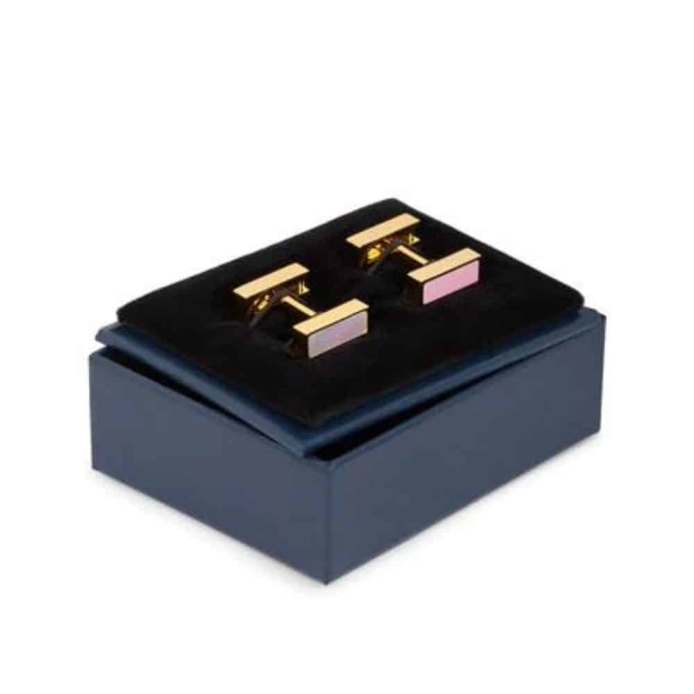 These mother of pearl folding cufflinks by Veritas have a sleek double rectangle design. One side of the gold plated cufflink features a mother of pearl inlay, whilst the other features a subtle pink enamel. This allows versatility through combinations of matching or mismatching the cufflinks. Wear these cufflinks with our French cuff Eton Shirts as a confident combination for a winning smart outfit.