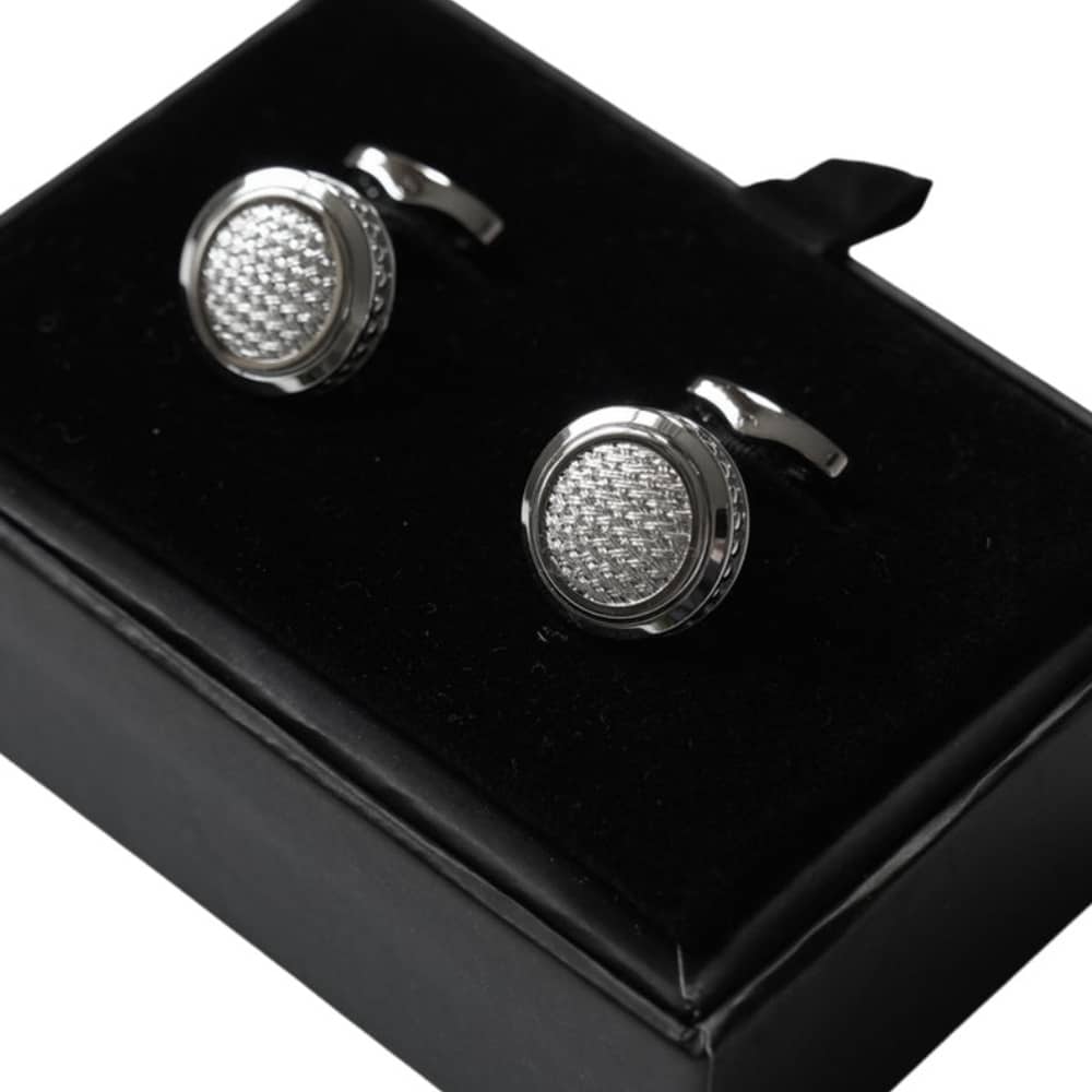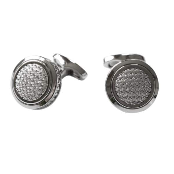 These silver circular cufflinks by Veritas is completed with a silver woven mesh inlay. Wear these cufflinks with our French cuff Eton Shirts as a confident combination for a winning smart outfit.