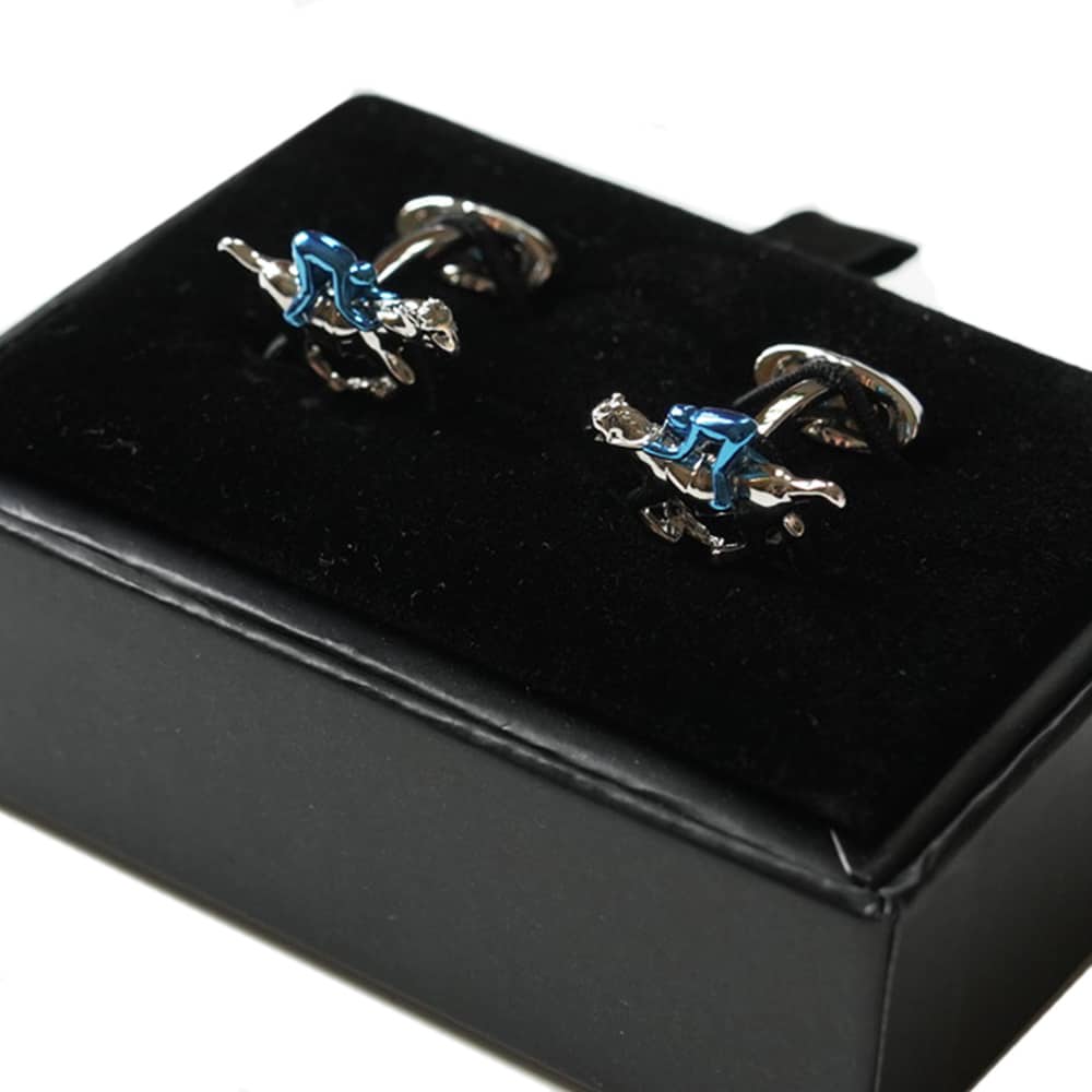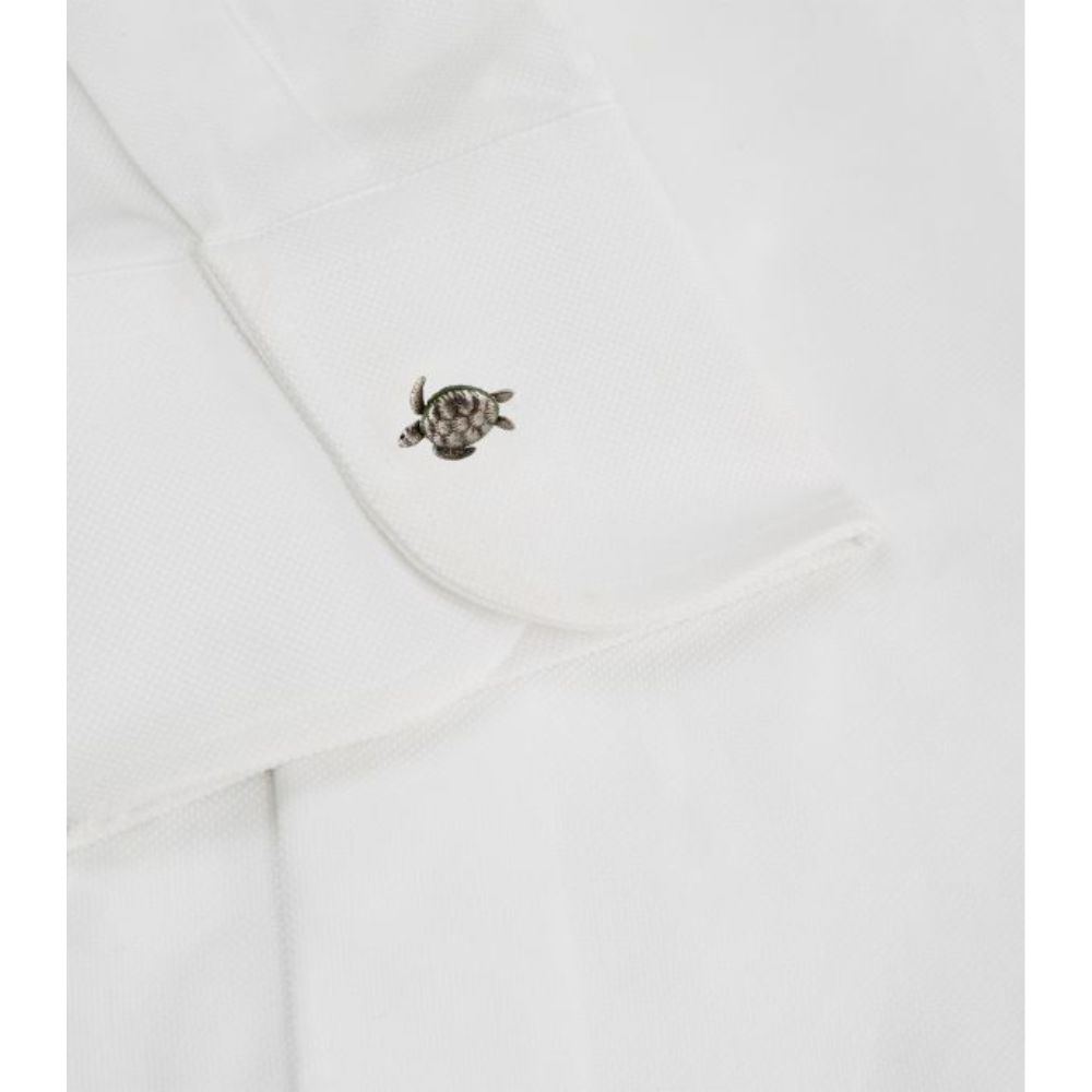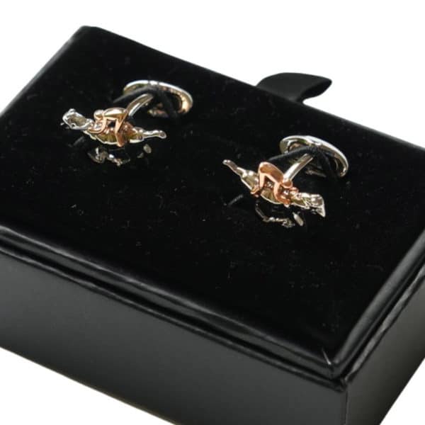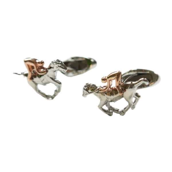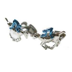 These silver horse cufflinks by Veritas is finished with a gold horse jockey in an aerodynamic pose. It is a great piece for race days and could be your new lucky charm. Wear these cufflinks with our French cuff Eton Shirts as a confident combination for a winning smart outfit.