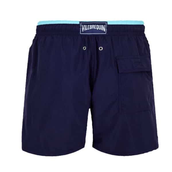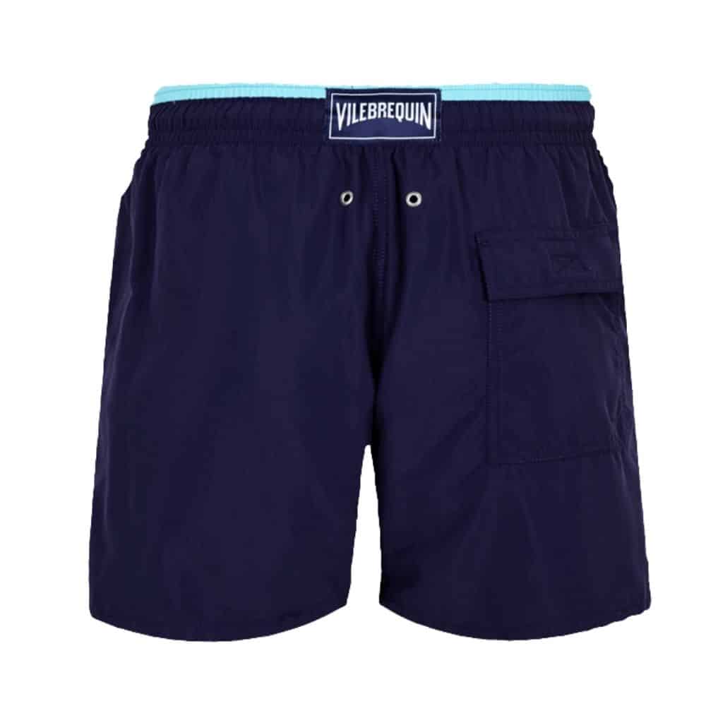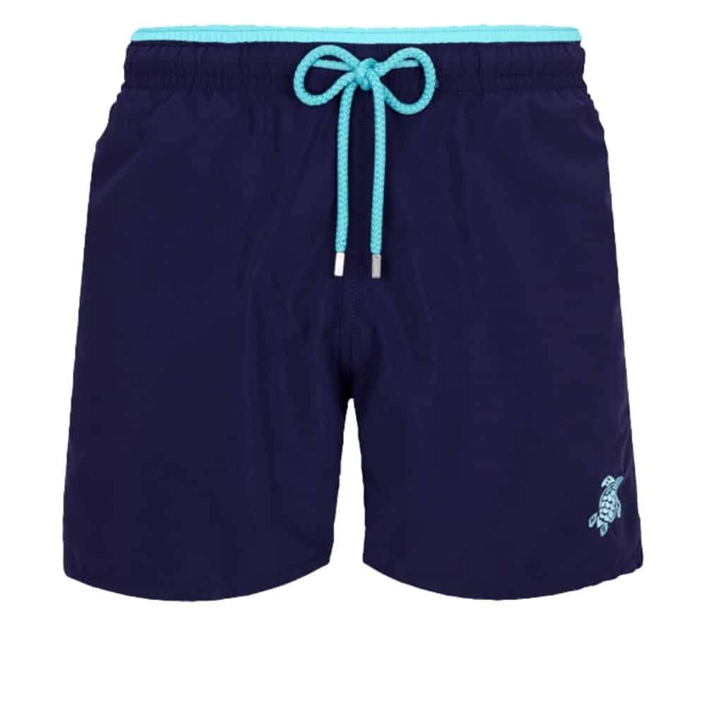 These Vilebrequin navy and Turquoise trim swim-shorts feature the signature turtle on left leg. They also come in a slim fit, while also having an elastic waist with a draw string and mesh inside. Travel bag included.