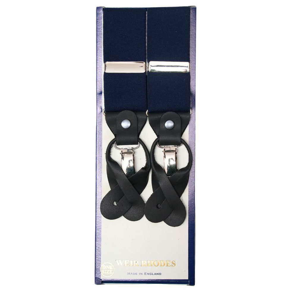 Warwick’s navy braces are a two-way styled brace. Featuring clip and trouser button attachments, Adjustable for all sizes. A lovely and stylish accessories to go with an outfit.