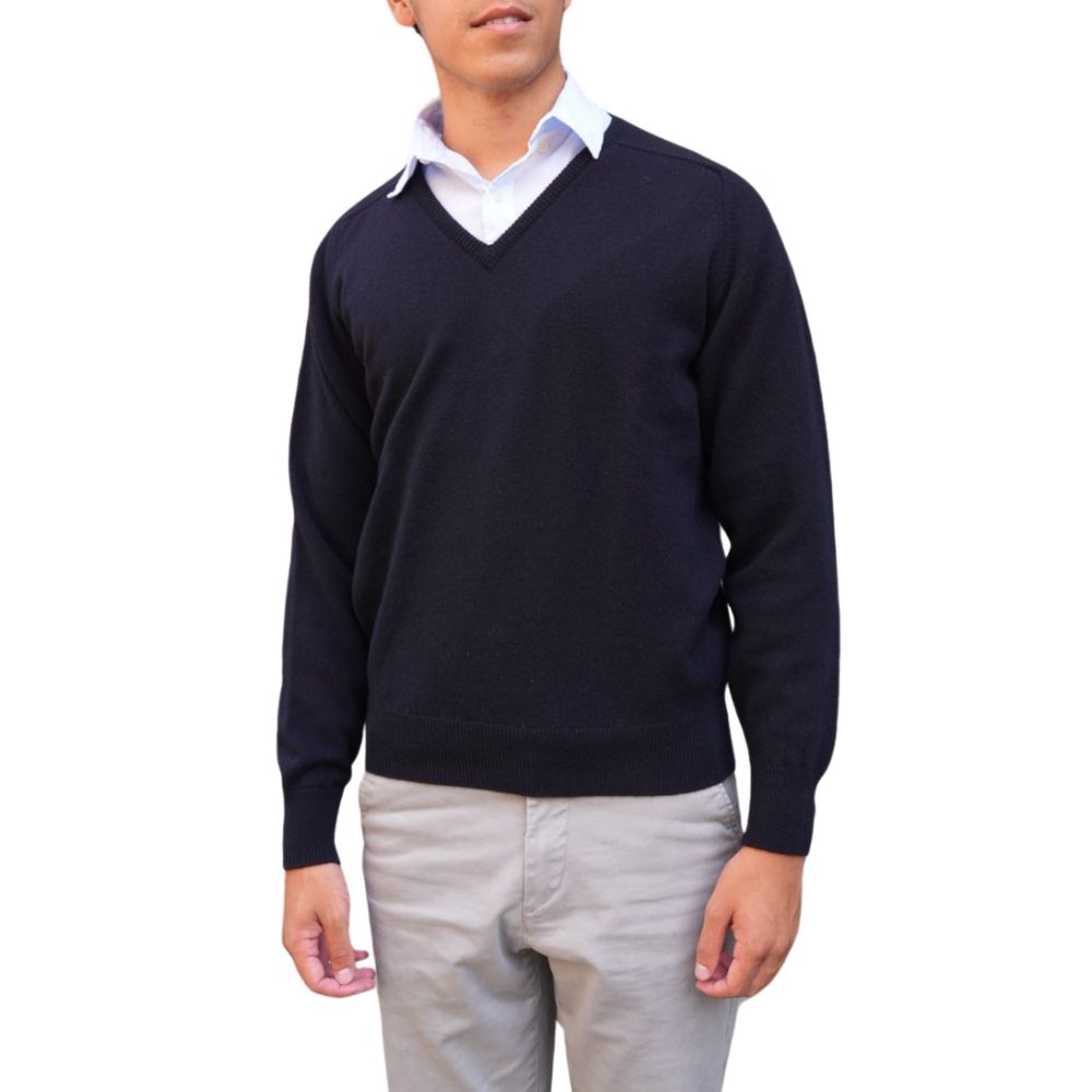 Indulge in unparalleled luxury with the Warwicks Navy V-Neck. Crafted from the softest lambswool, this sweater offers exceptional warmth with saddle shoulders and straight cuffs. Its timeless Navy colour effortlessly complements any outfit, while the classic V-neckline adds a touch of sophistication.