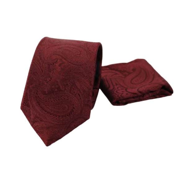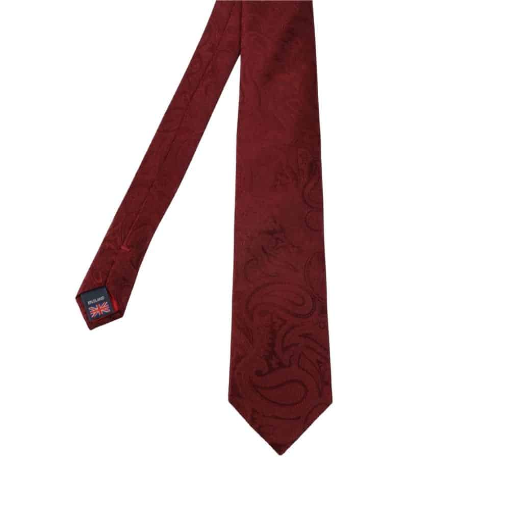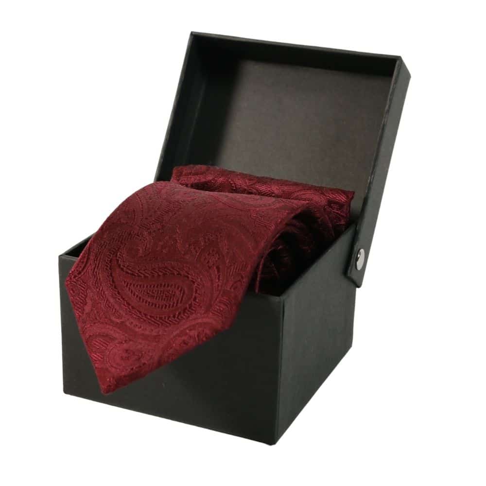 Warwicks Paisley Tie Box Set in Burgundy. This box set features a silk tie and matching pocket square. The tie has a jacquard knit paisley pattern in tonal colours for added detail. Made in England and comes presented in a box so is a great gift and accompaniment to outfits for formal occasions.