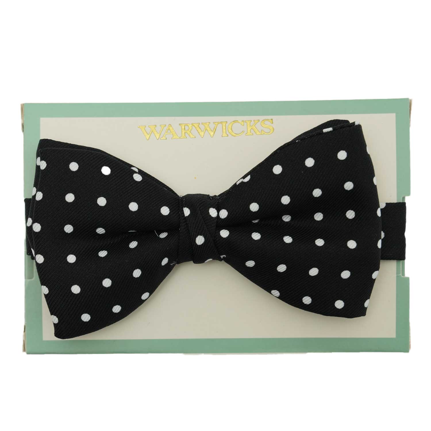This Warwicks Pre-Tied Black Bow Tie features white polka dots on a black background, making it perfect for adding personality to formal wear or a dressed-up night out. Pre-tied for your convenience, this bow tie ensures a perfect knot every time.