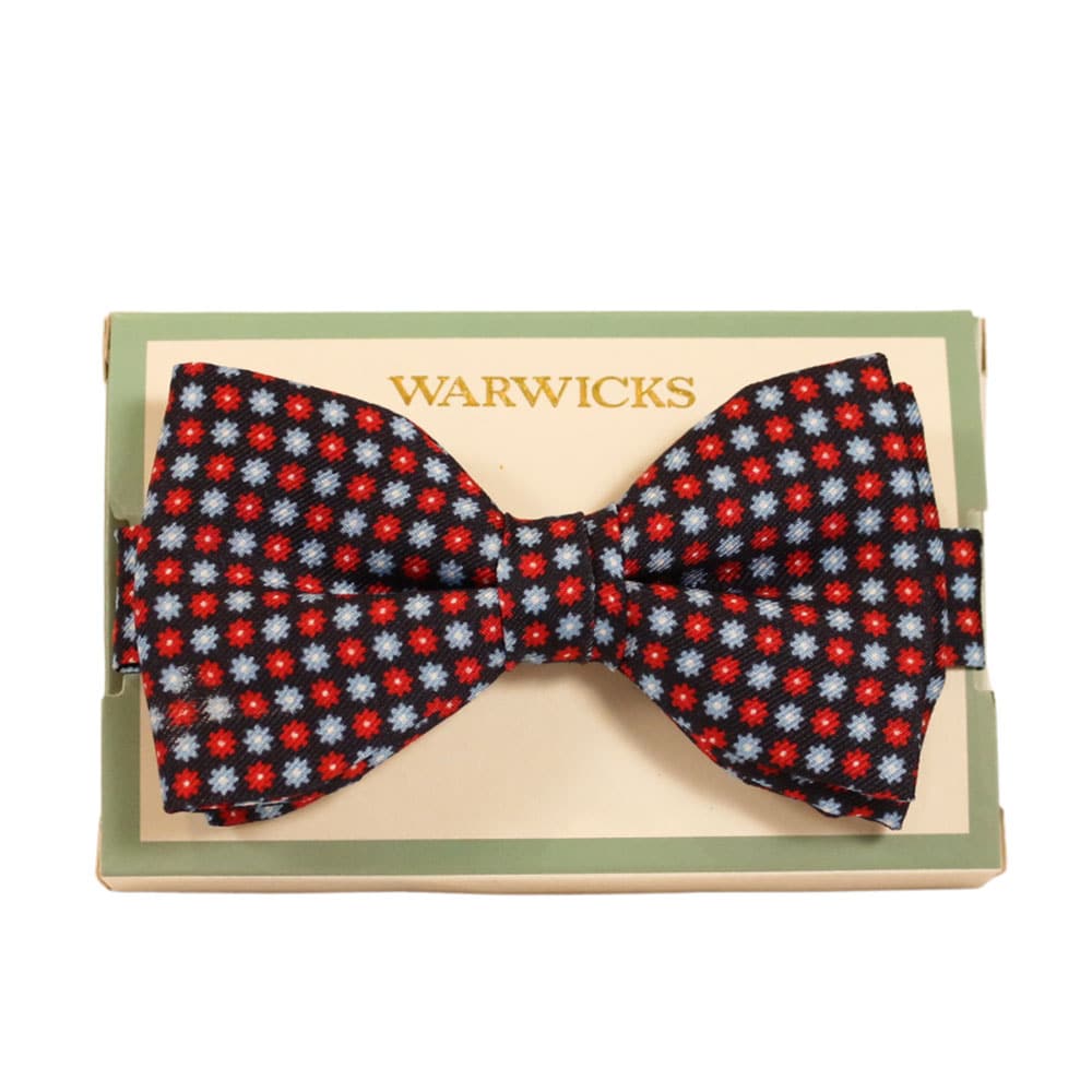 Warwicks Pre-Tied Flower Shape Bow Tie in Navy –  Made from Silk and featuring a print of flower shapes in alternating contrast colours. Pre-tied for ease of wear, with a hidden clip-on fastening.