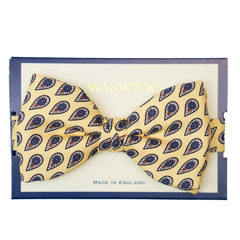 Warwicks Pre-Tied Paisley Cream Bow Tie – Made from Silk and featuring a printed paisley pattern in contrasting navy. Pre-tied for ease of wear, with a hidden clip-on fastening.