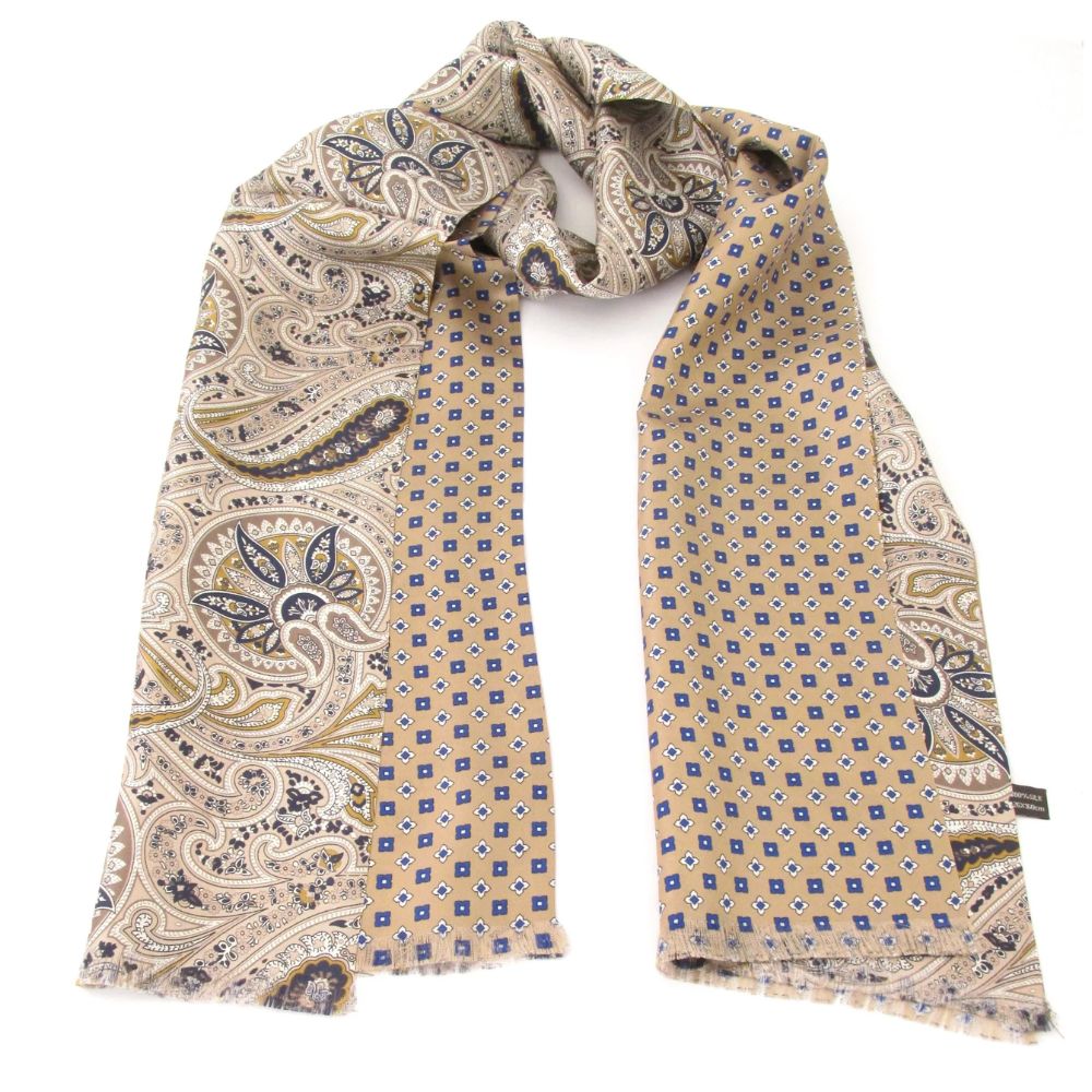 The Reversible Large Silk Dress Scarf features a classic beige paisley pattern on one side and a subtle beige medallion design on the other. Crafted from smooth, luxurious silk, this versatile accessory adds effortless elegance and refinement to both formal and smart-casual outfits.