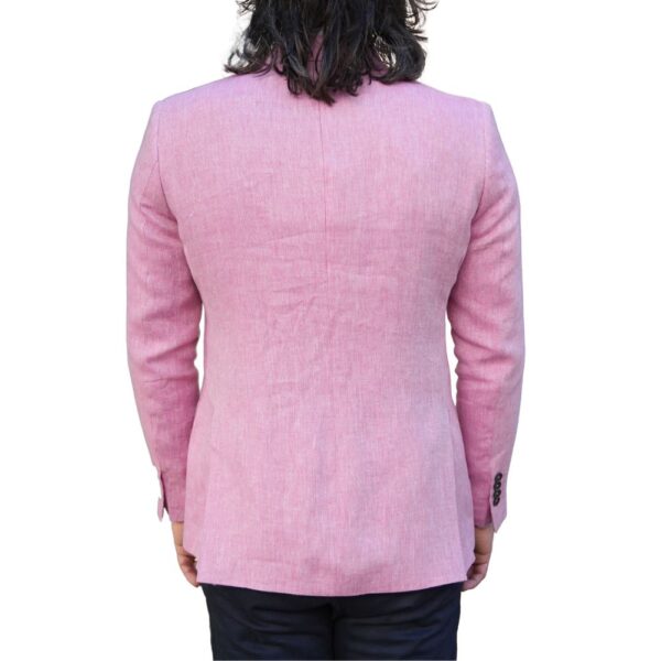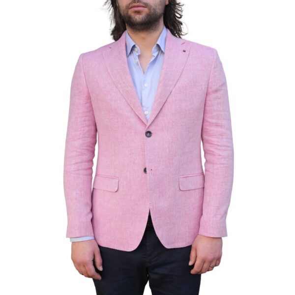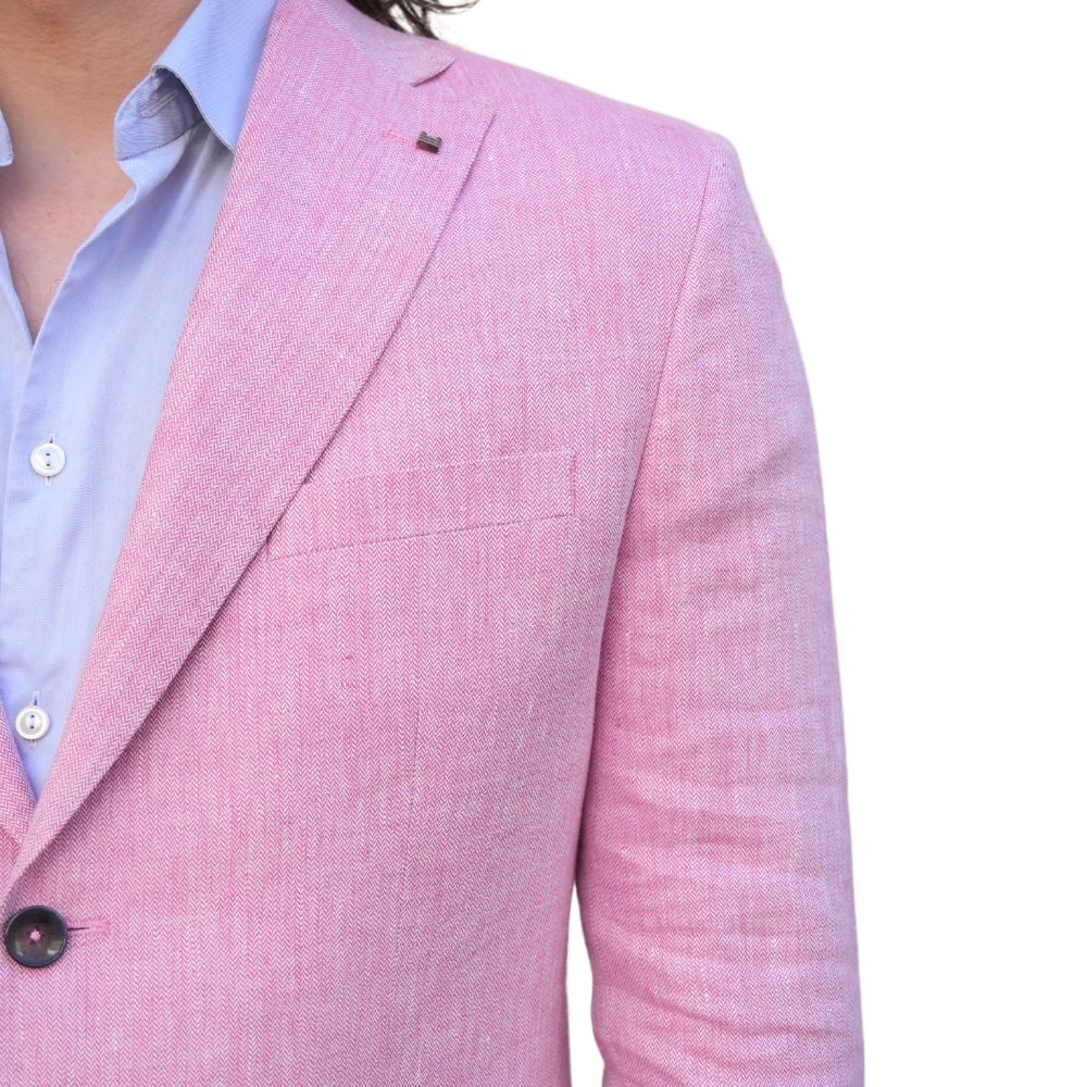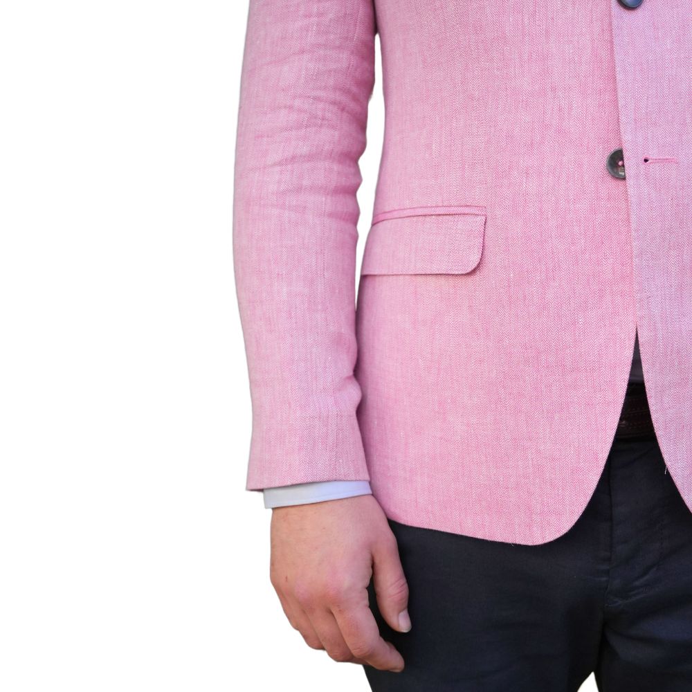 Warwick’s two-button regular fit Salmon Pink linen slim fit jacket is a gorgeous pastel pink jacket which proves a versatile piece, perfect for transitional and summer wear, a structured slim fit, pin dot lining jacket ideal for travelling by plane or car, or going to a social event. Made from a luxurious pure linen 100% fabric. With three inside pockets, two flap pockets and a piped chest pocket, it has all the room you need to keep your wallet, keys, phone and other essentials close to hand.