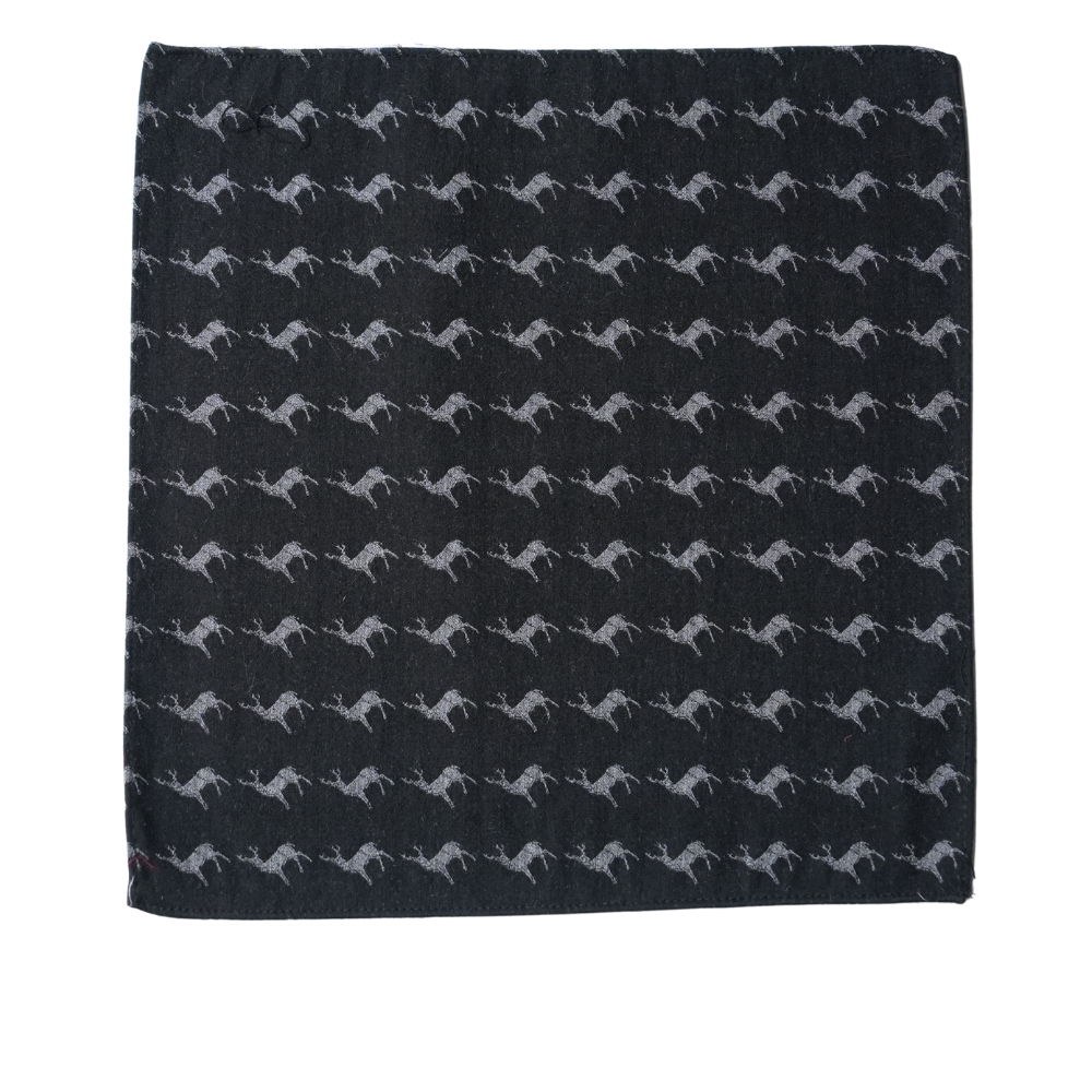 Warwicks black pocket square with deer’s woven into it, crafted with pure wool. This accessory is made in Italy.