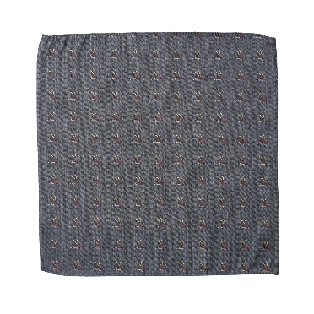 Warwicks grey pocket square with ducks woven into it, crafted with pure wool. This accessory is made in Italy.