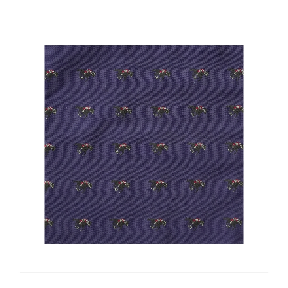 Warwicks purple pocket square with race horses woven into it, crafted with pure wool. This accessory is made in Italy.