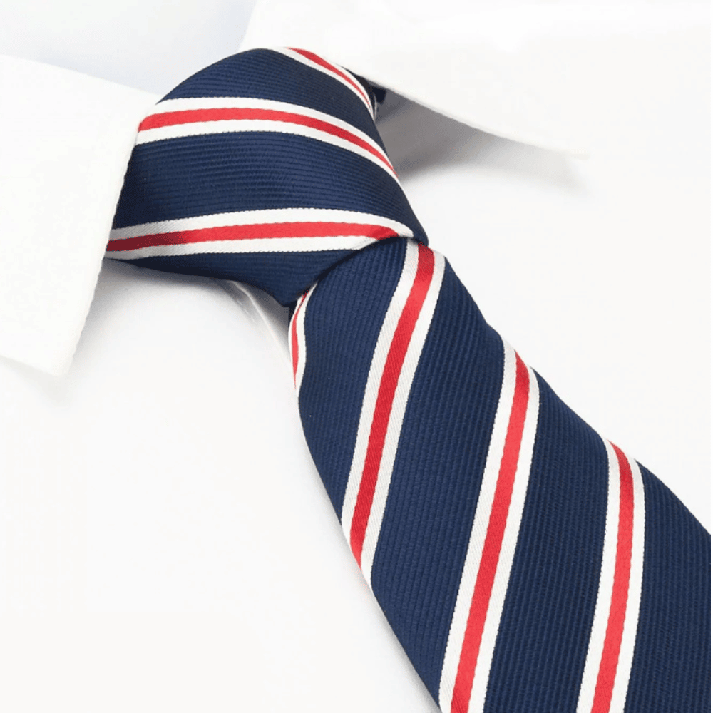 Enhance your formal attire with style and sophistication with this stunning regimental striped tie from Warwicks. Using a glorious colour combination of navy, white and red, this piece is certain to make you stand out from the crowd.